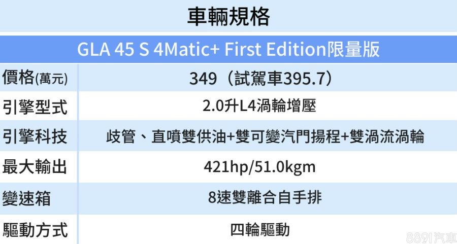 GLA 45 S目前在台提供兩種車型,分別為標準版與此次試駕的 First Edition限量版,按照原廠規劃、在2020年11月後便不再生產 First Edition版本,國內僅有50台配額,售價則分別為337萬與349萬。12萬元價差換來可變阻尼電子懸吊、AMG夜色套件與包含大尾翼在內的AMG空力套件,動力方面兩者皆完全相同,2.0升四缸渦輪引擎、421hp/51kgm,配上8速雙離合自手排,四輪驅動也同為最高階、具備後軸扭力分配的4Matic+系統。