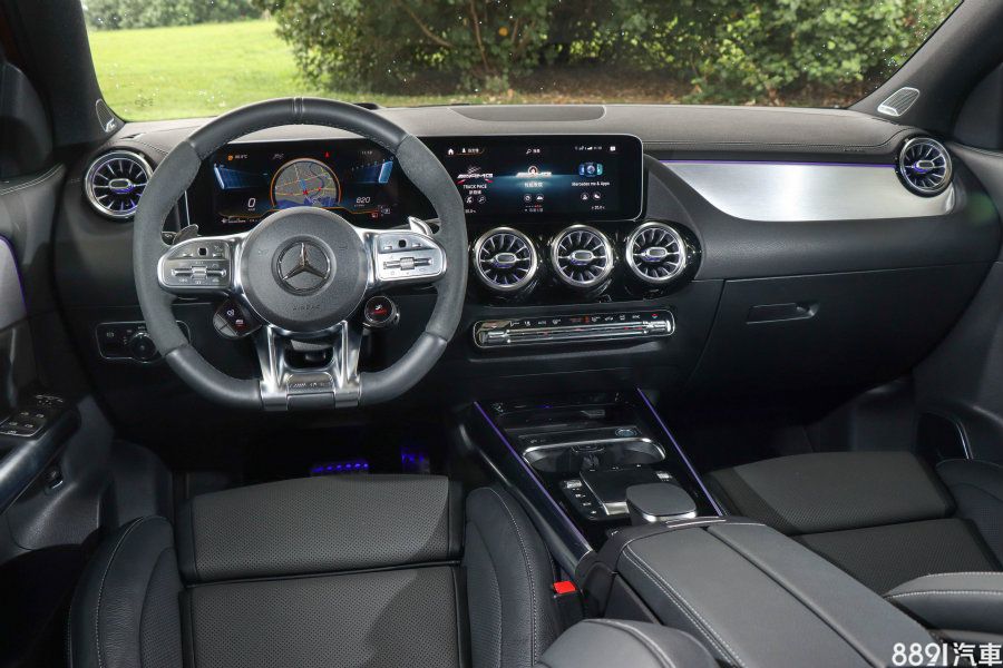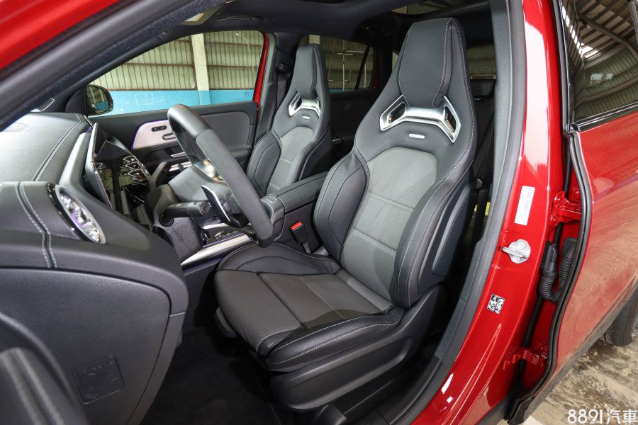 GLA 45 S即便試駕車選配了高階賽車座椅,乘坐點並沒有比較低,駕駛視野就是輛休旅車,不過標配AMG跑車方向盤,倒是讓性能味加分不少,兩側採用大面積麂皮外,非真圓造型也增加握持感,加上AMG專屬儀錶、黑色頂棚等配備,營造實用與熱血兼具的座艙風格。