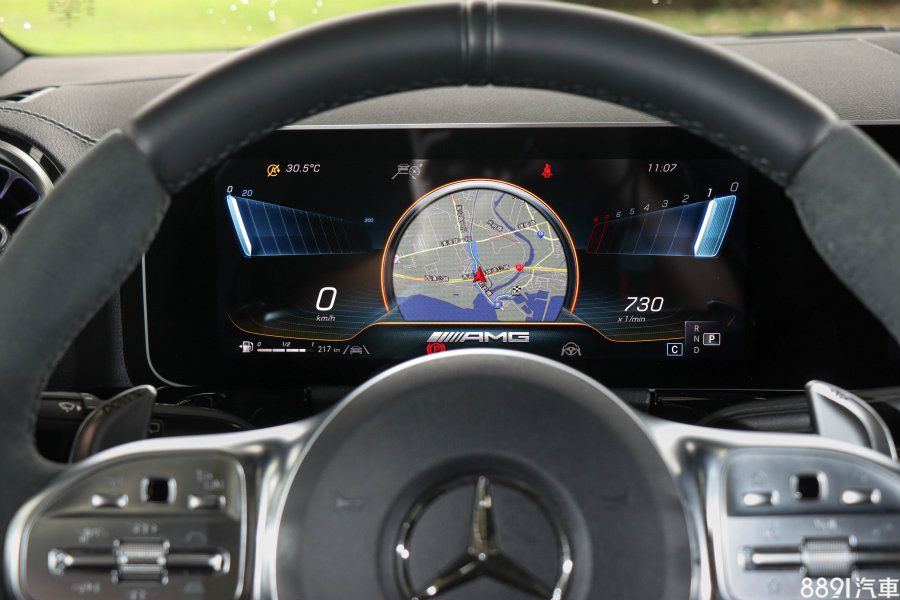 AMG車型有專屬儀錶介面,上頭除了有AMG字樣凸顯身份,中央資訊幕也可查看車輛出力、過彎G值等性能參數,讓駕駛快速掌握車輛狀態,如果需要查看地圖也可在上方顯示。