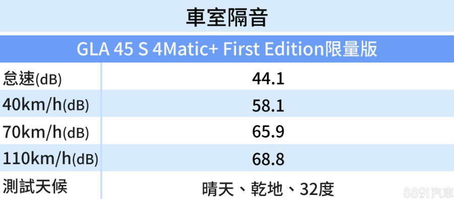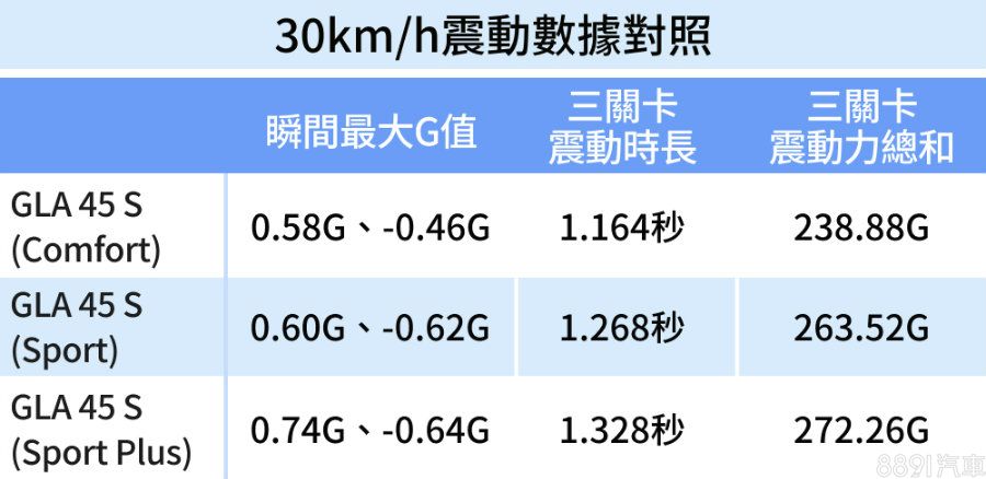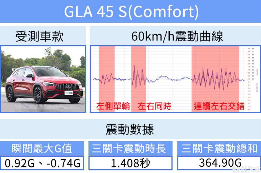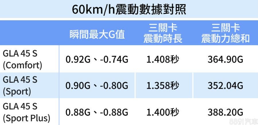 當然,GLA 45 S在定位上便不是將舒適性列為第一要務,從上表可以看出在60km/h車速下,各懸吊模式差異微乎其微,G值、時長、總和三項指標表現都相當接近,實際體感也是如此,一旦車速稍微拉高,GLA 45 在三種模式下都給人底盤硬朗、略帶躁動的性能車回饋。