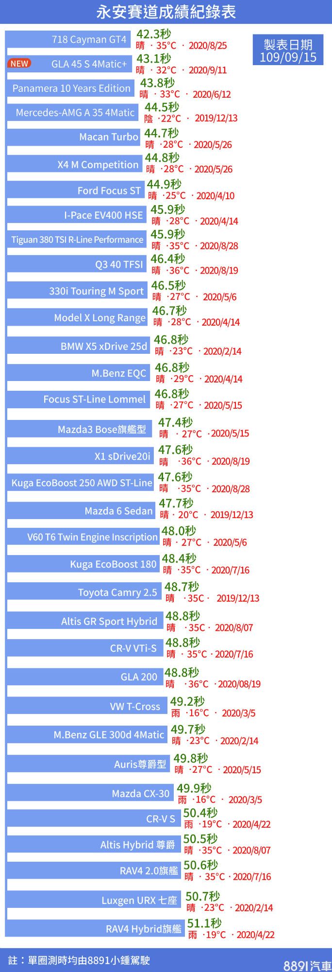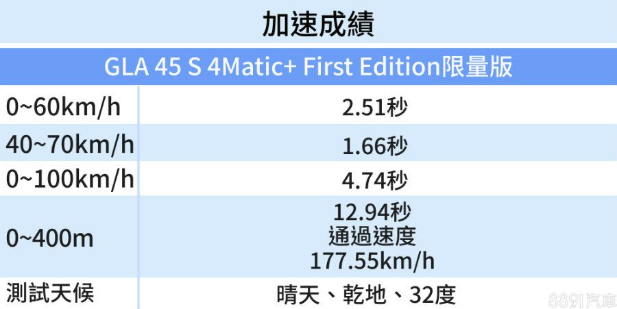 分析成績,這輛GLA 45 S繳出4.74秒百公里加速成績,零四通過則為12.94秒,對比先前測試過的A 45(0~100km/h:4.16秒、0~400m:12.3秒@184.24km/h)明顯要慢了些許,也比原廠數據4.3秒要慢,但經過冷卻、反覆測試後都繳出4.7秒左右的百公里加速,表現未盡理想。