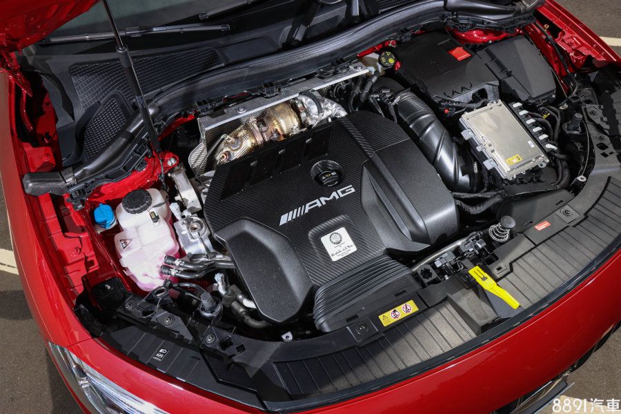 引擎蓋下裝載有著「市售最強」稱號的2.0升四缸渦輪引擎,手工組裝並簽名負責的銘牌宣告著AMG「一軍」身分,引擎本體與擋火牆之間碩大渦輪有著2.1Bar的高增壓設定,這讓GLA 45 S有著421hp/6750rpm、51.0kgm/5000~5250rpm最大輸出,動力精華帶較偏向高轉設定。深入探討這具代號M139的高性能引擎,採用滾珠軸承渦輪、鍛造活塞/曲軸/連桿、奈米鍍膜缸壁,再配上一套電子水泵補驅動的複雜冷卻系統,老實說並沒有太過驚人的黑科技,但一項項技術往上堆疊,再輔以精密人工組裝,卻也造就這具引擎每公升排氣量210.5hp強悍輸出效率。