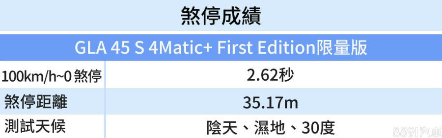 GLA 45 S煞車規格對得起強悍動力,前對六活塞卡鉗配360mm碟盤、後單活塞卡鉗配330mm加大碟,再加上胎寬達255的馬牌SC6性能跑胎,大腳煞車踹下,能感受ABS與輪胎相互角力,讓車身不偏不倚地停下。在煞車規格與輪胎表現優異的搭配下,即使測試當下路面微濕,煞停距離也僅有35.17m,符合GLA 45 S高性能車的絕佳表現。
