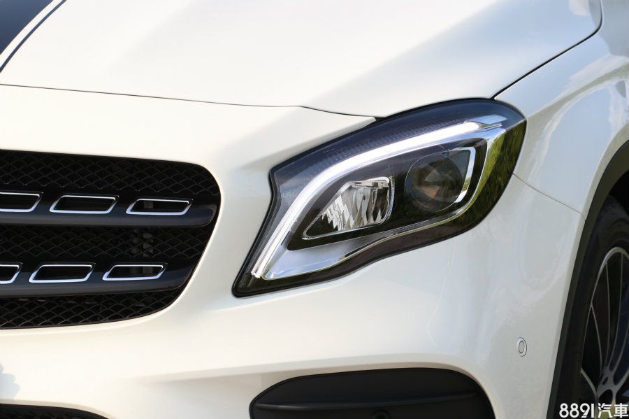小改款GLA與舊款最大差異於水箱護罩的改變,採用銀式鍍鉻方鑽造型,整齊排列在水箱罩上,陽光下閃閃動人,受惠於White Atr Edition選配套件,引擎蓋特別多出賽車飾條彩貼,此設計貼工相當精細,尤其在鈑件接合處處理得相當服貼,搭配起來,帶來更豐富的高級感。