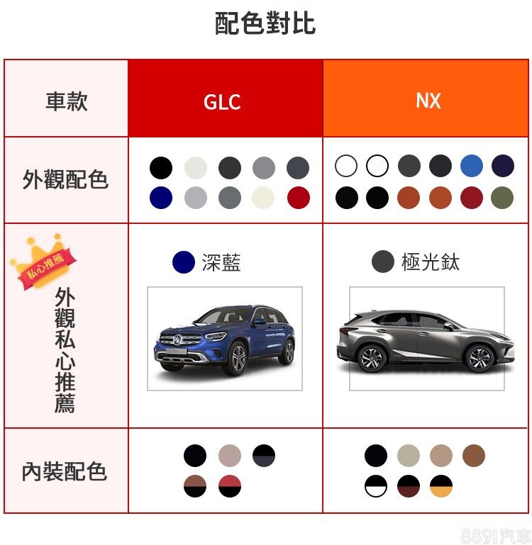 兩車提供的內外配色選擇都相當豐富,特別是NX還有少見的熔岩橘、熾焰橘及大地綠等特殊色,不過私心推薦的是易於養護但又不會太過平淡的極光鈦,質感比起白色或灰色更顯出眾。GLC則是推薦深藍,不會太過高調又可跳脫車陣之中。