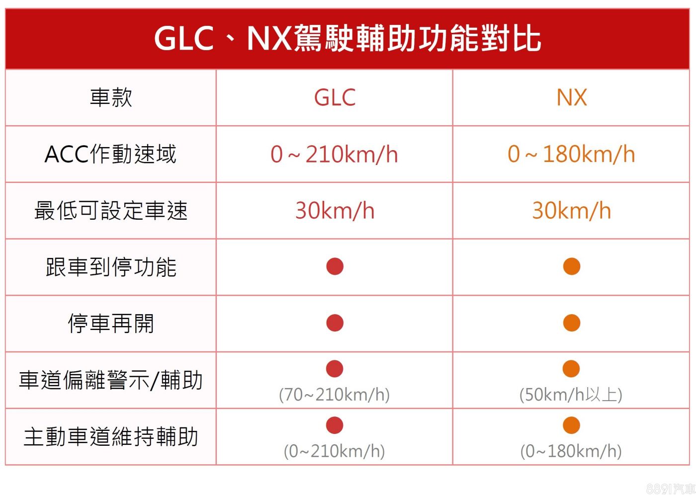 全速域ACC及主動車道維持輔助幾乎已成為此級距的必備項目,GLC及NX都是全車系標配,功能差異也不大,但NX的盲點偵測及後方車側警示只有300h以上等級才能享有,是美中不足的地方。