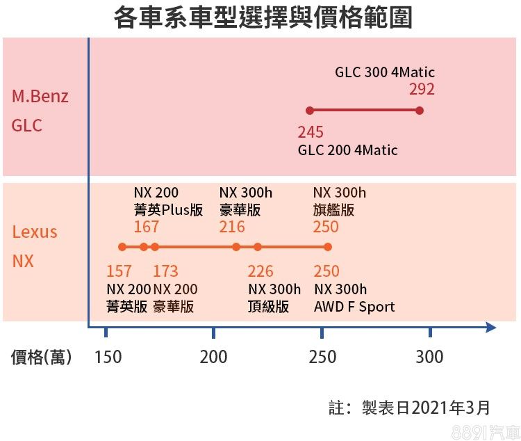 全車系多達7車型的NX,儘管不少舒適配備都集中在高階的NX 300h,但因整體價格帶就是比GLC來得便宜,C/P值自然高出不少。若GLC想比照NX的配備清單辦理,勢必得再多花些預算於選配項目上,車價又會再往上提升。