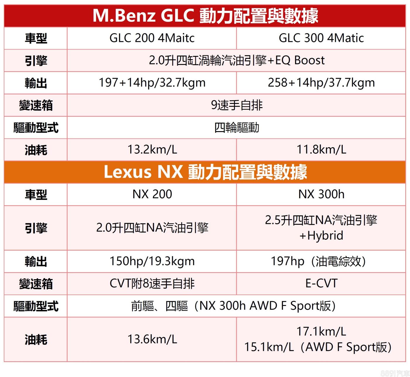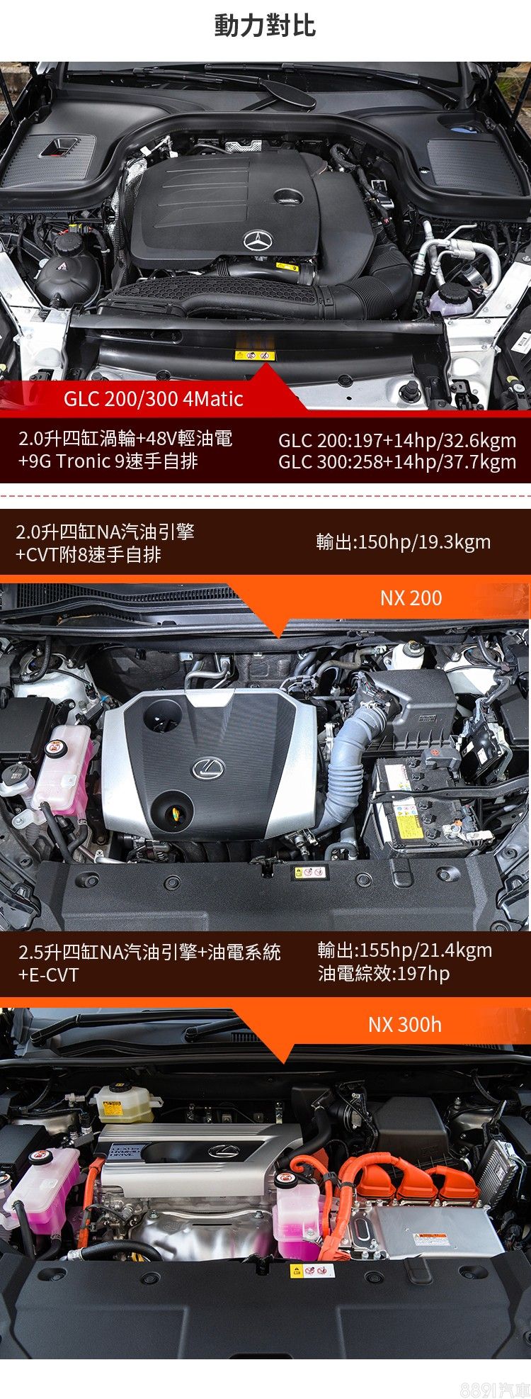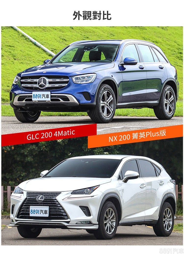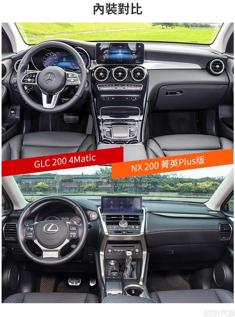 論性能表現,GLC毫無疑問勝出,即便是GLC 200都有7.9秒加速破百的實力,反觀輸出相近的NX 300h,原廠公布的0~100km/h加速都還需9.2秒,更不用提入門的NX 200。油耗部分,自然是採用Hybrid系統的NX 300h最佔優勢,不過2.5升排氣量的稅金也高人一等,是需要衡量的地方。