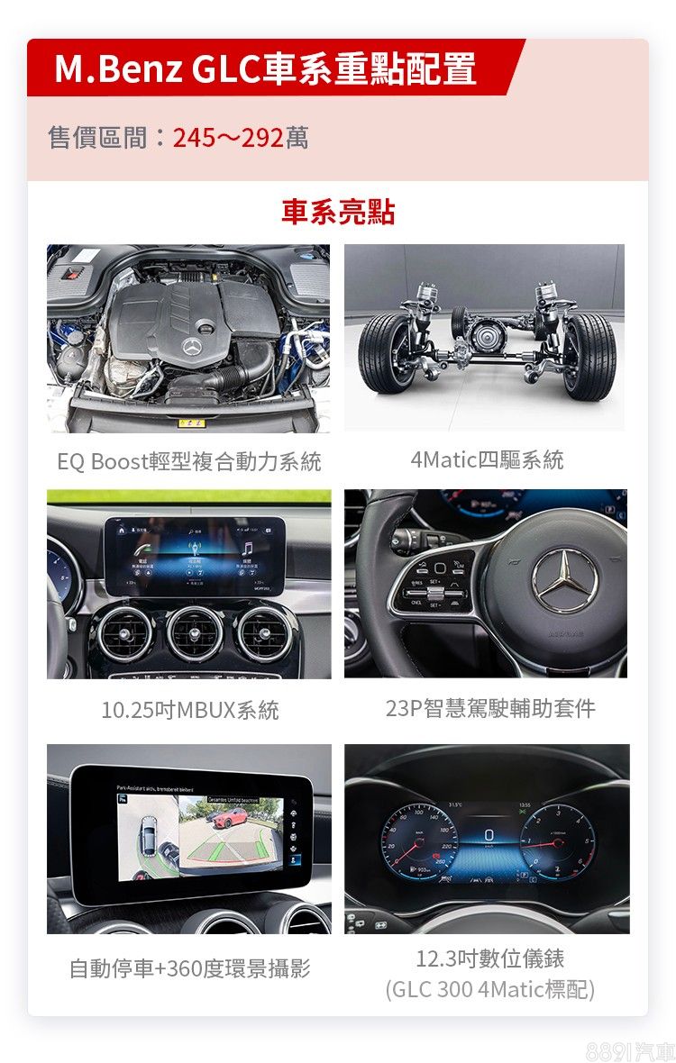 新年式GLC新增自動停車輔助、360度環景攝影、原廠中文導航及四驅系統為全車系標配,並將12.3吋數位儀錶加入GLC 300的標配清單中。23P駕駛輔助、Keyless、感應式電動尾門及64色環艙氣氛燈等都早已俱全,基本配備和實用性已到位。