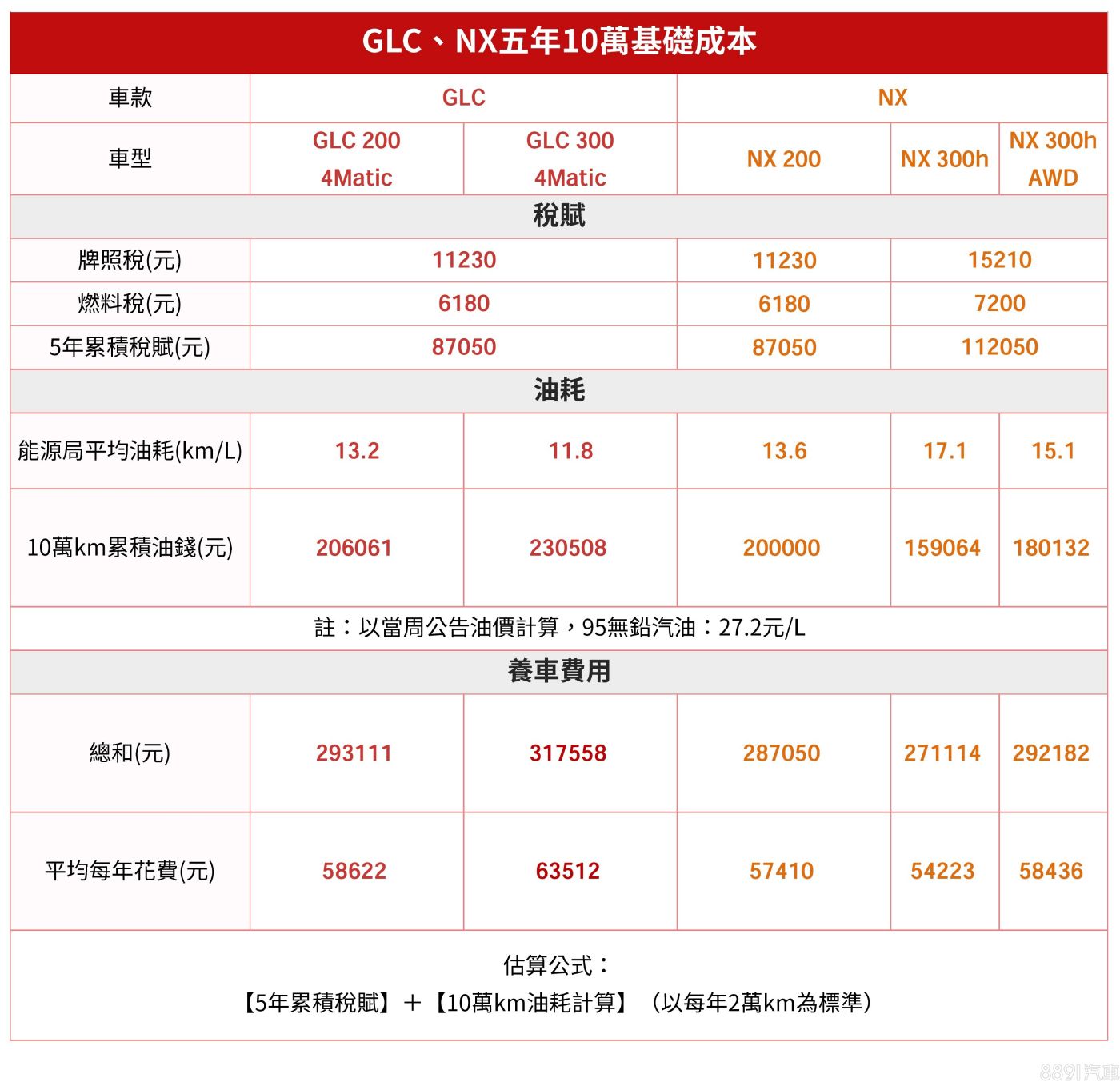 兩車養車平均每年花費差距至多不超過1萬元,最便宜者為平均油耗最好的NX 300h前驅車型,儘管稅賦增加一個級距,但10萬km累積下來的油錢倒是省回來不少,和平均油耗最差的GLC 300 4Matic相比省超過7萬元,突顯油電系統節能的優勢。