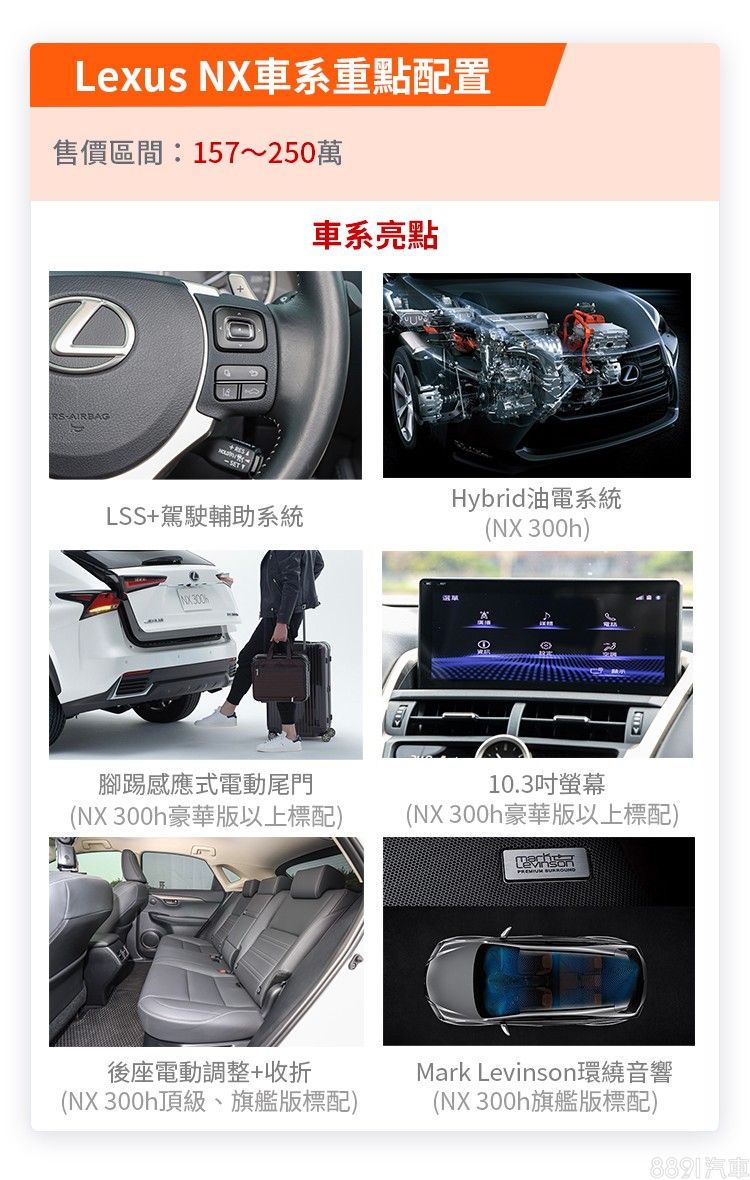 入門的NX 200採用2.0升四缸自然進氣引擎,最大輸出為150hp/19.3kgm,變速箱為可模擬6速檔位的CVT無段變速系統。高階的NX 300h則以2.5升四缸自然進氣為本體,結合電動馬達成為Hybrid油電系統,綜效輸出達到197hp。