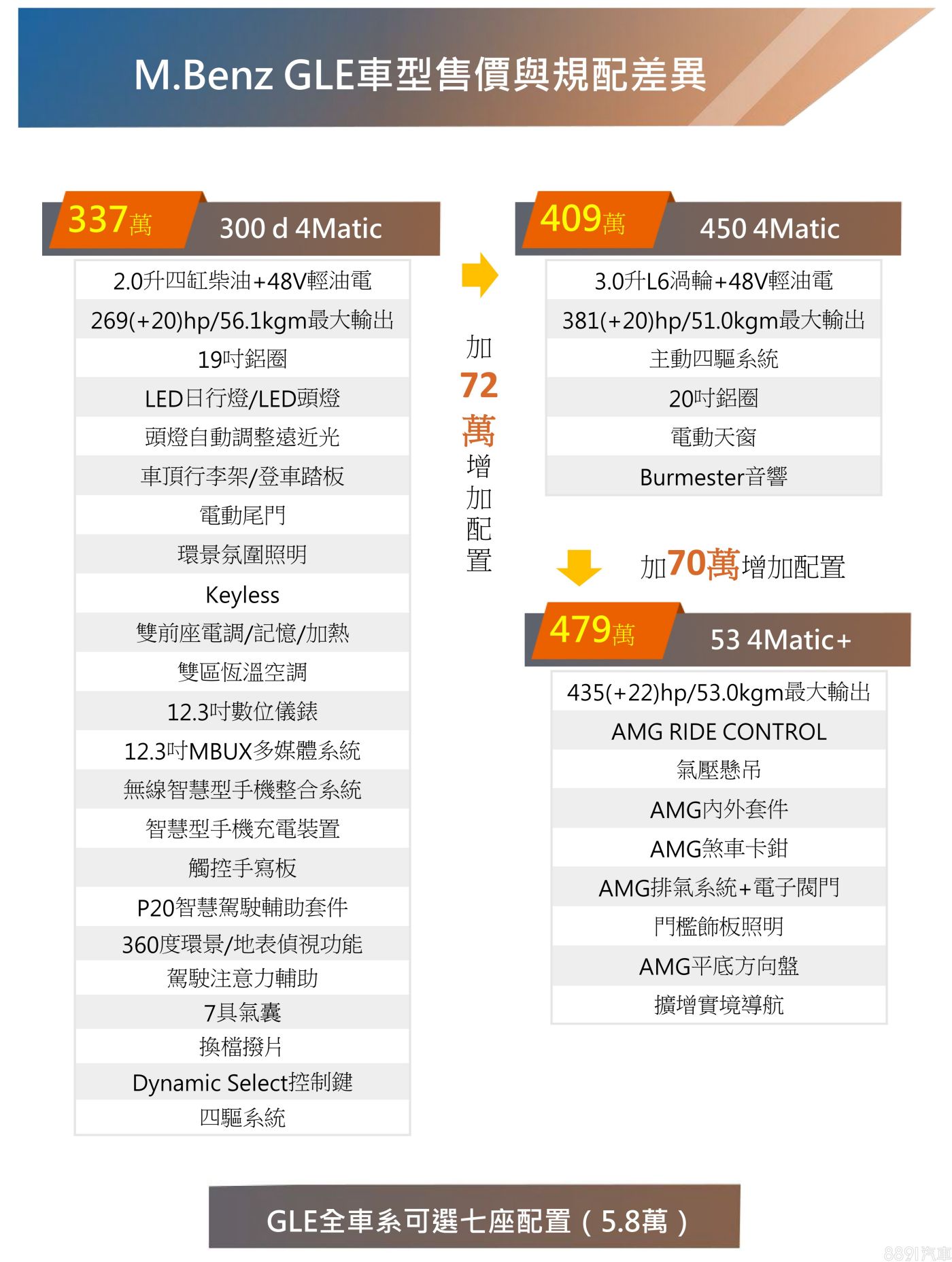 小改款GLE同樣端出三款車型,但全車系售價有著10~20萬不等漲幅,以配備來看其實差異不大,比較有感的,就是過往Burmester音響得選配才有,現在450 4Matic以上等級納入標配,反倒是既有功能性優化比較有感,像是多了OTA功能的MBUX 2.0,CarPlay/Android Auto變成無線,以及越野透視底盤、導航擴增實境等新功能。