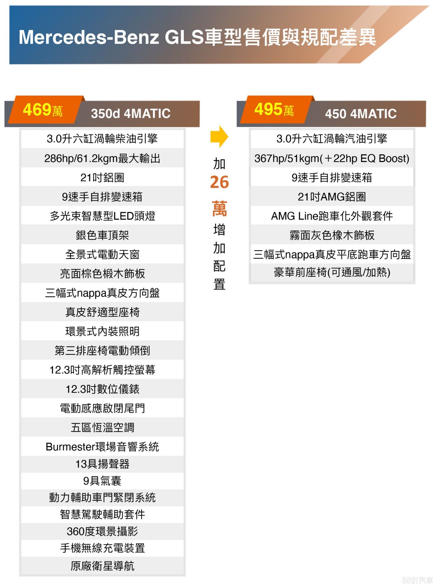 與350d 4Matic最大的差異除了動力單元由柴油改為汽油,450 4Matic也換上AMG Line外觀套件,雖然350d 4Matic的配備其實已算是相當豐富,但價差26萬能買到更帥氣的外觀、更飽滿的動力,還能擁有「車系頂規」的尊榮身份象徵。