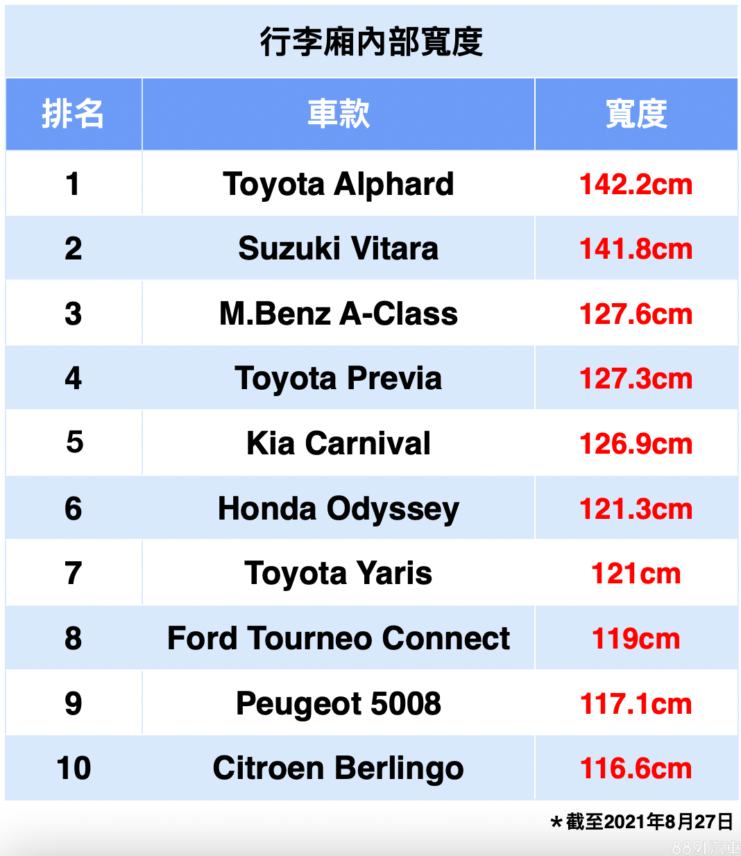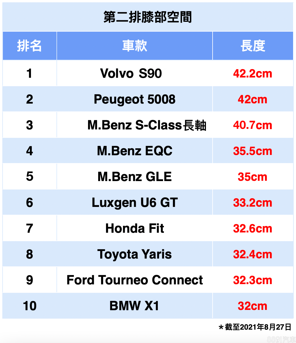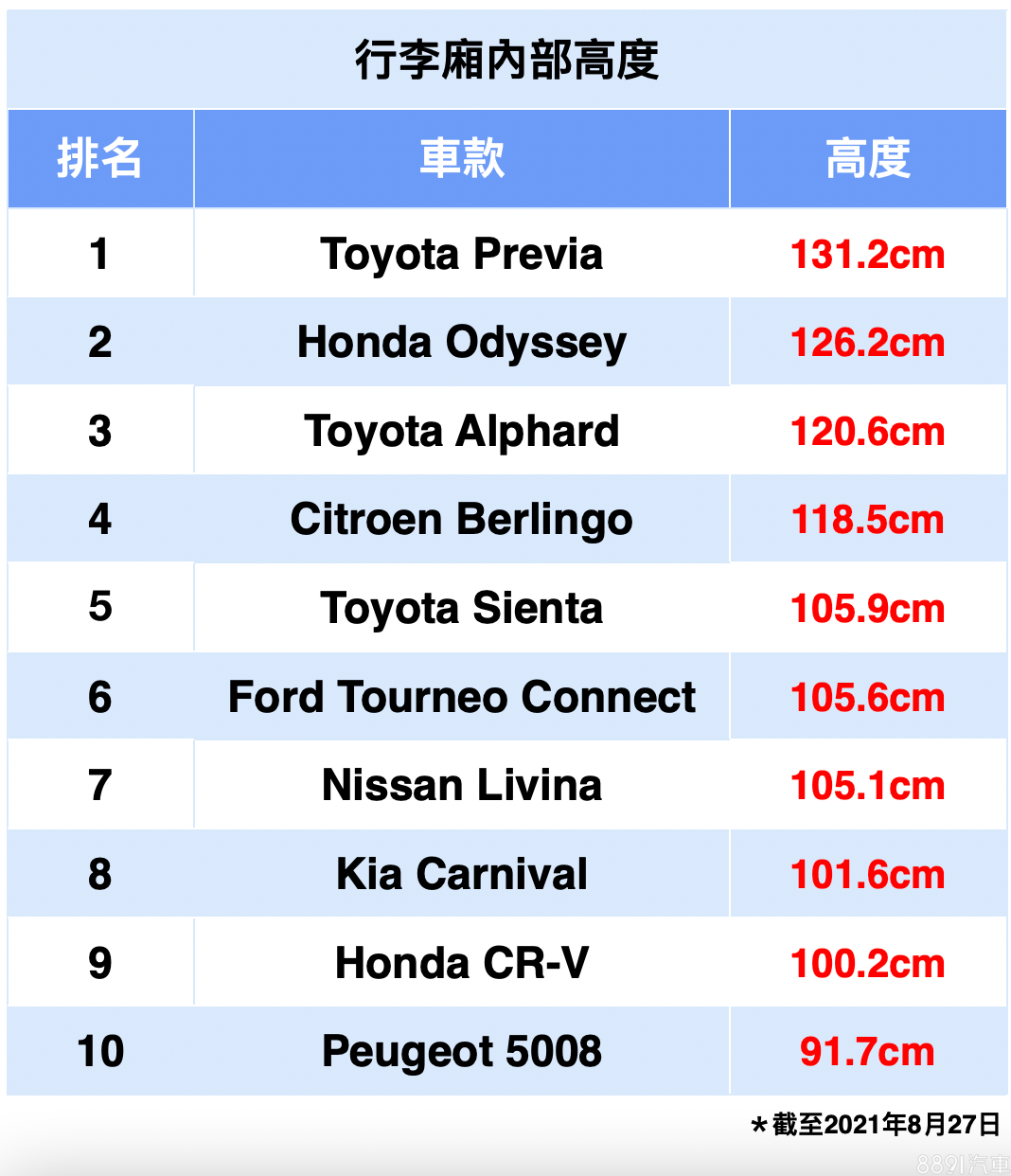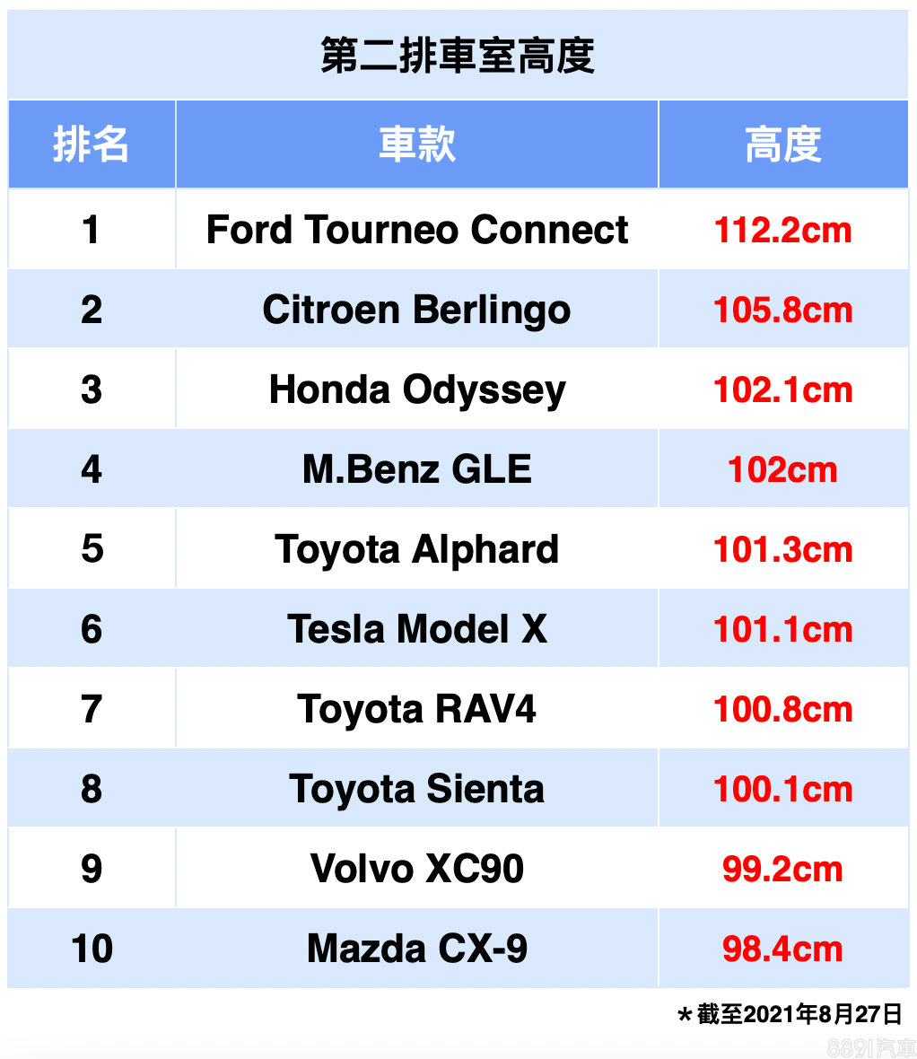 來到後座寬度就是MPV車款的天下,前10名中有6款都是所謂的「廂型車」,體現強大的乘載能力,不論載人載物都有充裕舒適度與便利性。