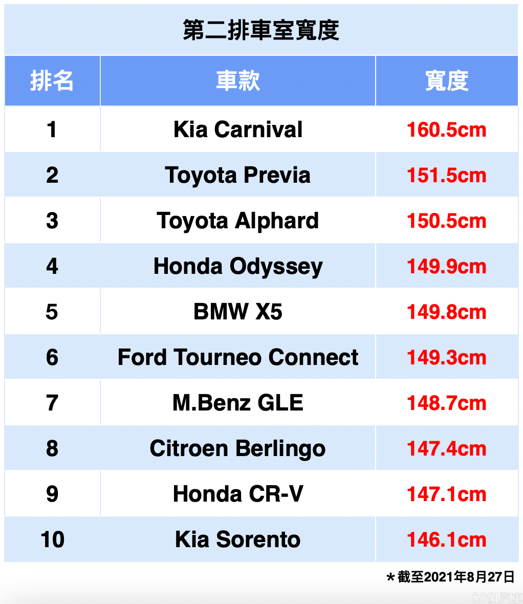 高居第1的是前代Kia Carnival,雖然已是舊款車型,但後排寬度一口氣達到160.5cm,比第2名Previa多了9cm之譜,是相當優異的數字,不論第二排是雙座或三座配置,都能有相當寬裕的空間。