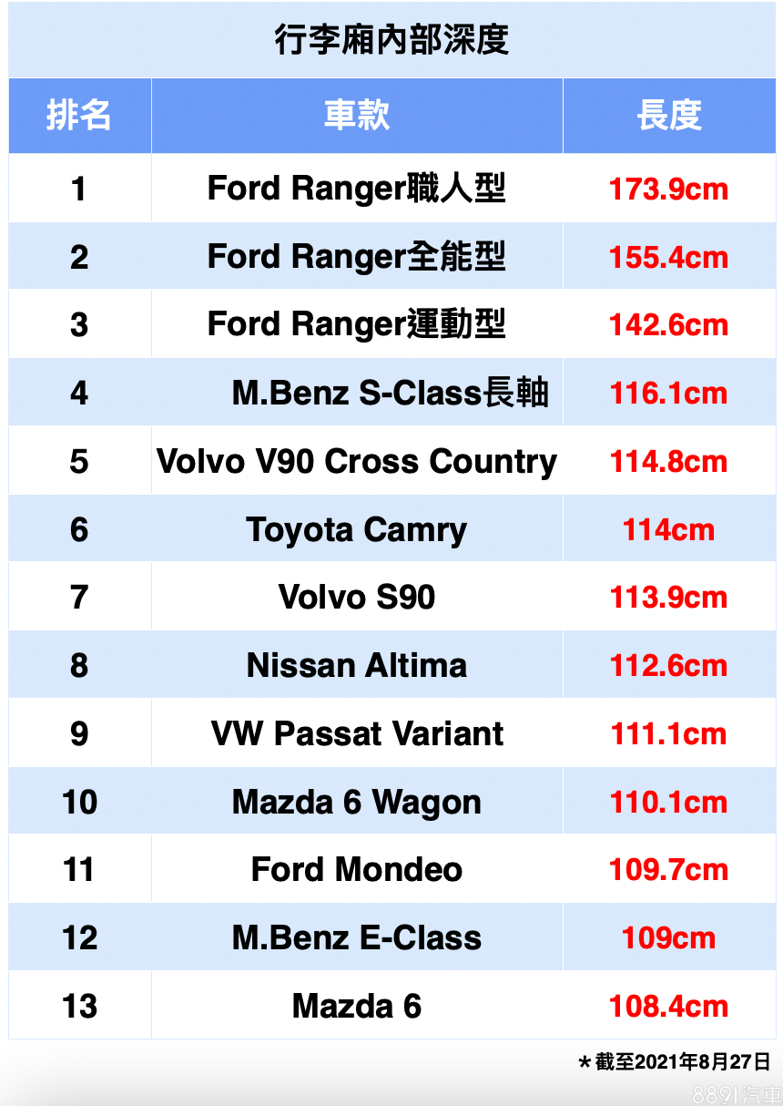 行李廂深度是取後座椅背「不倒平」的數據進行排名,這樣較貼近日常用車情況,畢竟多數人不會隨時將後座倒平,而前3名不意外的由Ranger系列拿下,不過貨卡車型較特殊,所以我們將榜單往後列舉至13名。