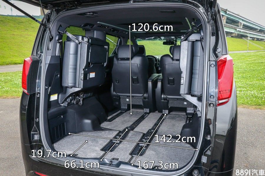 拜車身尺碼所賜,Alphard拿下第1名並不意外,廂型車體既方正又寬敞,雖然Alphard主要目的不是用來載物,但若是擔任機場接送等商業用途,也是會遇到需要放行李的需求,即使滿載七人、後方也有足夠空間放入多組行李箱,稍加堆疊、要滿足全車乘客的行李並不難。