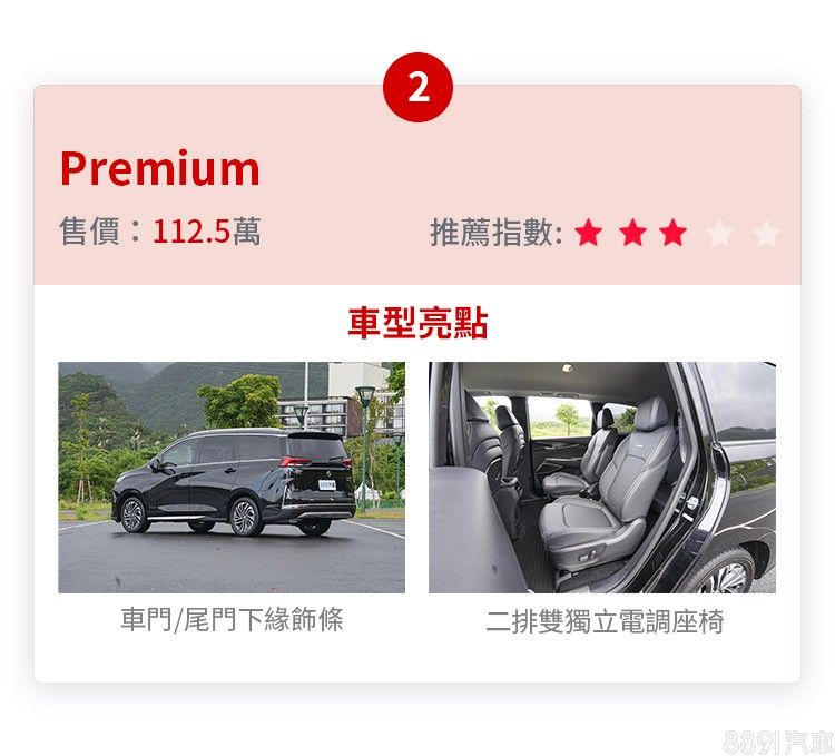 Premium套件多雙獨立電動調整座,但以通勤家用來說,其實後座調整的頻率不會太高,買一般旗艦版手動調整其實就很夠用了。其餘像是64色氣氛燈、迎賓燈、外觀裝飾件等,都屬於錦上添花的配備,對於實用性並無加分,買旗艦版的配備與空間配置其實就很好用了。