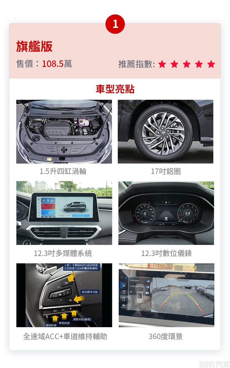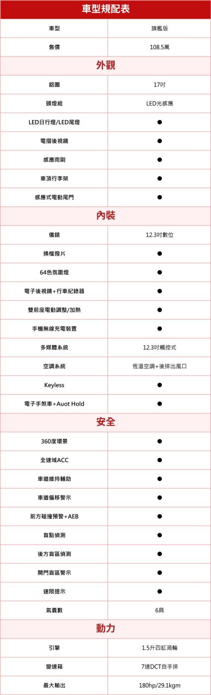 旗艦版以108.5萬把大部分家庭在意的功能一次到位,雙12.3吋螢幕、全速域ACC+車道維持、360環景、雙區恆溫、電子後視鏡+行車紀錄、手機無線充電等都標配,是預算精準又不想錯過重點的人首選。若你主要以通勤與偶爾全家出遊為主、第二排乘客大多是小孩,旗艦版的CP值極高。