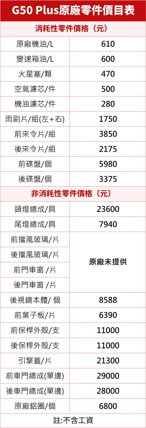非消耗性零件部分,一旦發生碰撞,修復成本不低,特別是頭燈總成單側價格高達23600元,車門總成(單邊)的價格前車門為29000元,後車門為28000元。如果是從消耗性零件來看,除了前碟盤價格較高之外,其餘項目都不貴,日常保養方面G50 Plus算是親民。