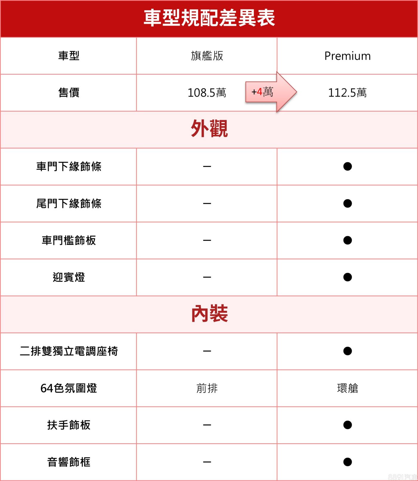 雙12.3吋(多媒體+數位儀錶)、雙區恆溫含後排出風口、電子後視鏡+行車紀錄、手機無線充電、Keyless、電子手煞+Auto Hold與360環景,旗艦版一次給齊;Premium再加二排雙獨立電動座椅與64色氣氛燈,屬「乘坐升級取向」,有長輩長途乘坐或重儀式感再考慮。