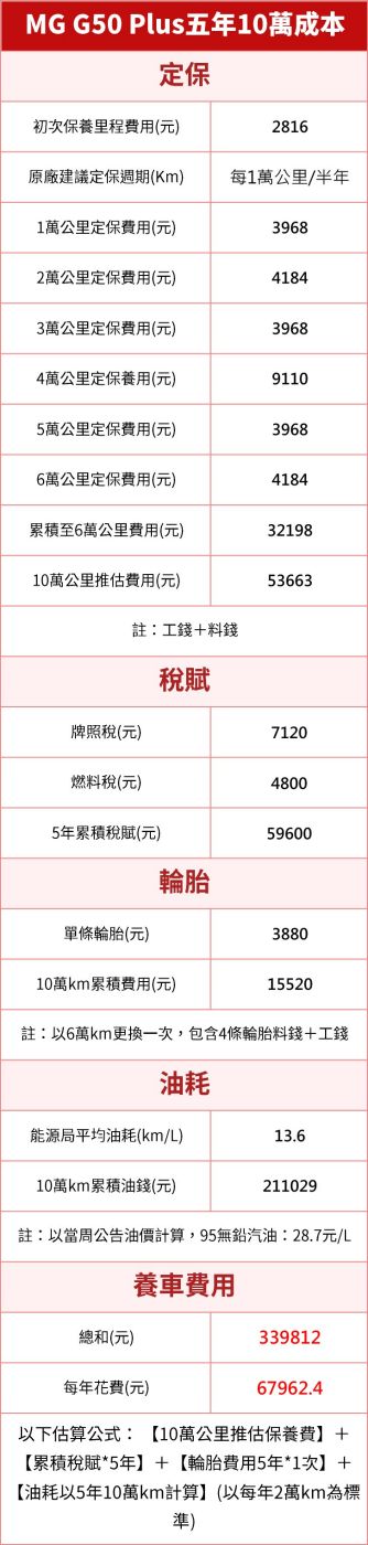 G50 Plus的保養週期是每半年或1萬公里進廠保養,以整體定期保養來看價格不貴,換胎價格也平易近人,和同級對手Custin表現相當,唯獨油耗部分會是比較大開銷,13.6km/L的油耗屬同級後段班,累積10萬公里油錢達211029元。