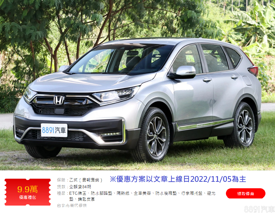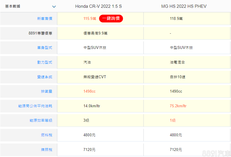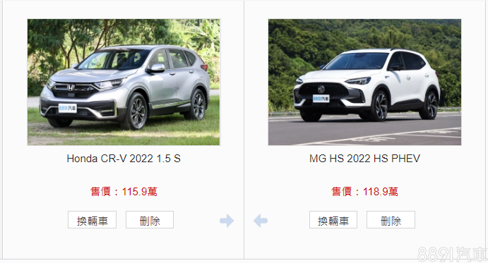 目前在8891一鍵詢價功能中,CR-V提供最高9.9萬的優惠,較可惜的是MG品牌初返台灣,目前尚未與我們有配合的專屬業代,未來若有相關服務,我們也會以最即時的速度上線。