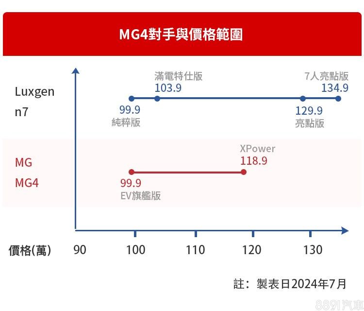 MG4國產純電小跨界的身分,在台灣市場並無直接對手,但若以價格來看,正好可以對上同樣是話題度很高的Luxgen n7,雖然n7是大一號的中型休旅,但兩者起始價同樣、價格帶也相近,如果預算相同,很容易就會一起列入考慮名單。