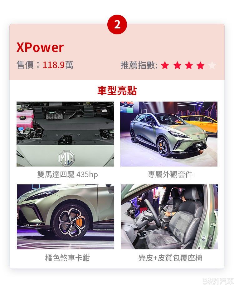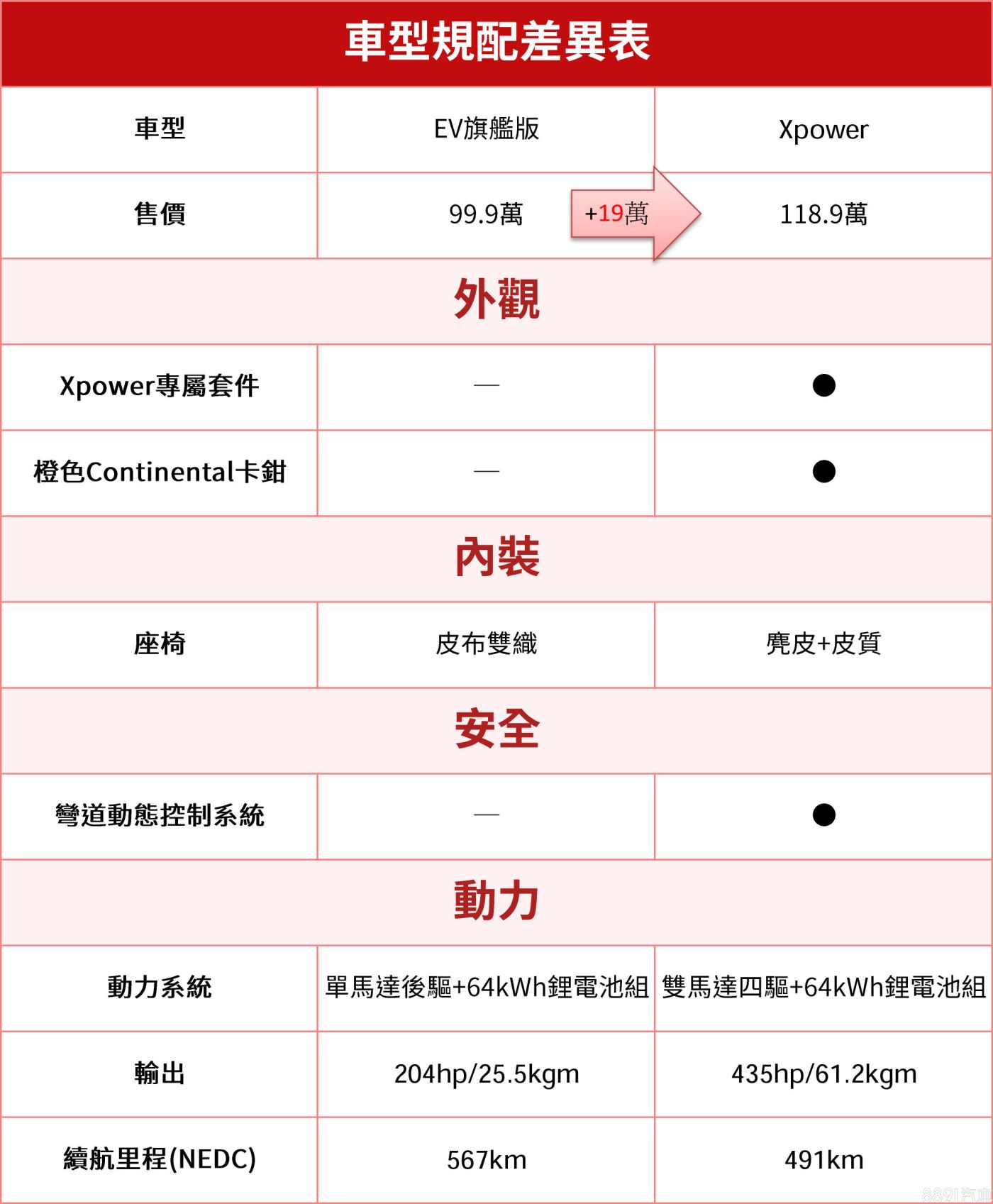 XPower相比入門款,主要差在前軸多了一具電動馬達,讓輸出一口氣提升至435hp之譜,一躍成為新科「國產馬力王」,並搭上專屬運動化套件,以不到120萬價位來看,性能表現確實是一大賣點,稍嫌可惜的是配備面並沒有太多升級,少了一點頂規的獨特性。