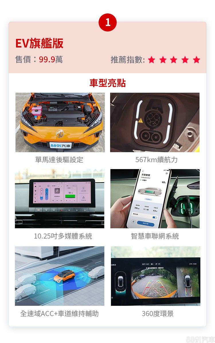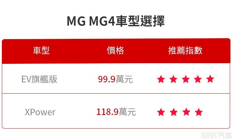 MG4編成設定很簡單,就是單馬達「EV旗艦版」及雙馬達「XPower版」,各自鎖定的不同目標客群,前者開價不到百萬,是國內最便宜的電動乘用車,後者則以435hp最大輸出,坐擁國產馬力王的頭銜,但畢竟這類小跨界多是通勤代步需求,性能非第一考量,且入門款配備就很豐富,沒有必要直上頂規,因此最推薦給普羅買家。