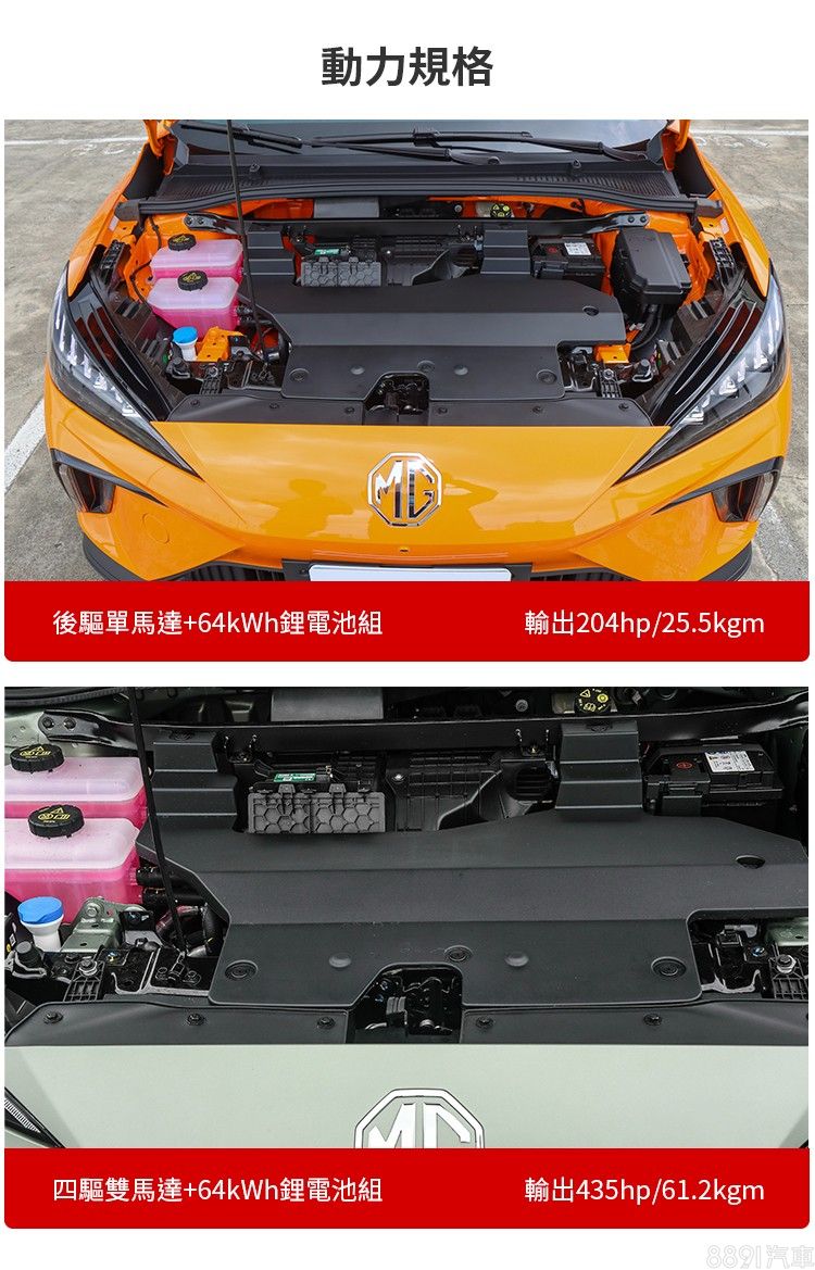 MG4有兩種動力可挑,入門款採單馬達後驅,XPower則為雙馬達四驅,均搭配64kWh鋰電池組,出力各為204hp/25.5kgm與435hp/61.2kgm,具備4段動能回充調整、單踏板模式等等,其中XPowre版另有起步彈射功能,原廠公布破百加速僅消3.8秒,以這價位來說,性能表現確實高水準。