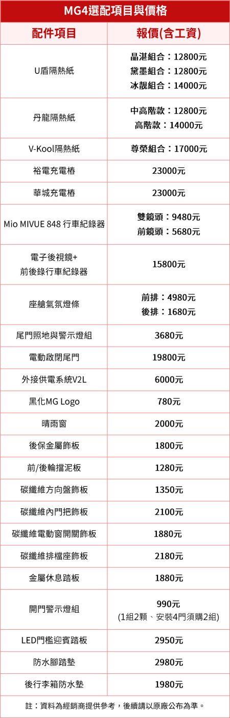 雖然MG4「入門即滿配」,但經銷商還是有提供不少選配項目,像是便利的電動尾門花不到2萬就可做升級,如果你是「視覺系」至上的車主,也能加選黑化Logo、碳纖維內裝飾件等提點個人風格!