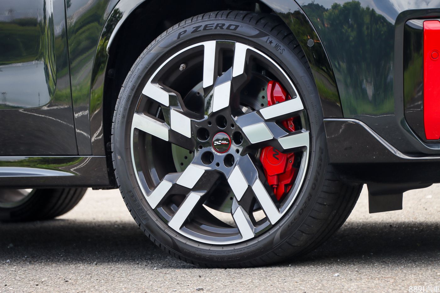 JCW Countryman標配19吋JCW Runway Spoke輪圈,不過試駕車升級選配20吋JCW Flag Spoke雙色輪圈(選配價未提供),搭配245/40R20的倍耐力P Zero跑胎與顯眼的紅色JCW煞車,抓地力與制動力都很夠用。