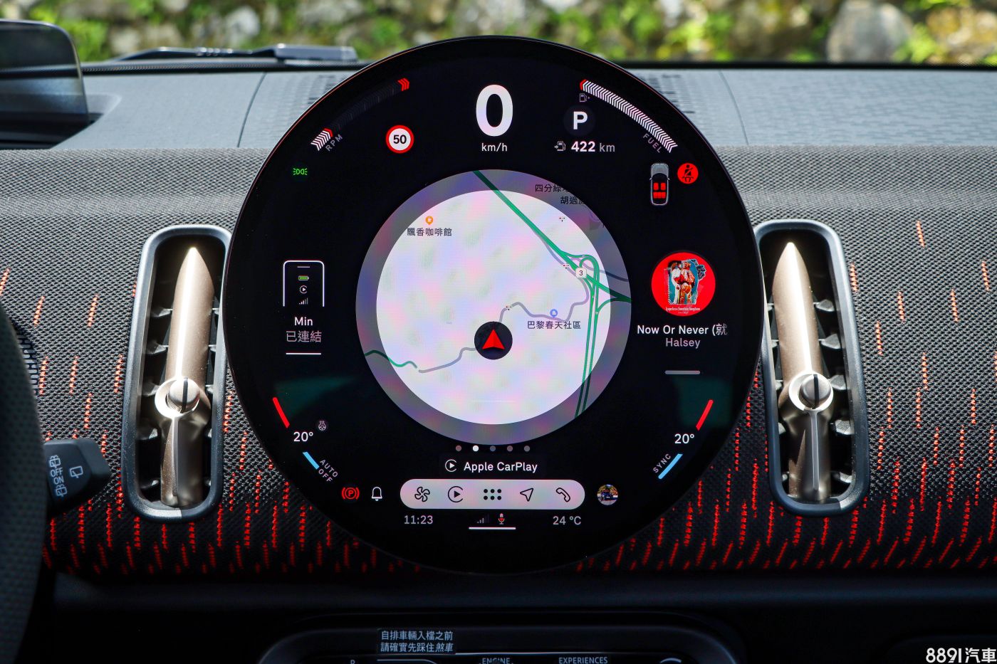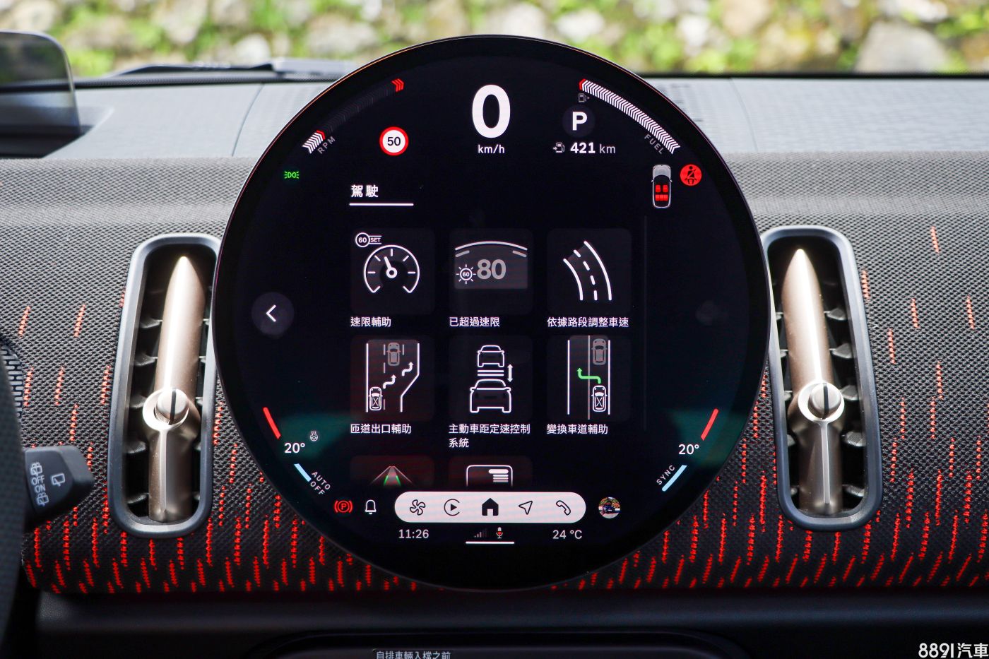 這具直徑24cm的OLED中控螢幕是全車精華所在,內建Mini OS 9系統,畫質、成色的表現沒得挑剔,不過也由於要塞入時速、檔位、油量、空調介面等眾多功能,畫面有些繁雜,初次接觸會覺得有點「不知從哪下手」,可以花上好一陣子慢慢摸索。
