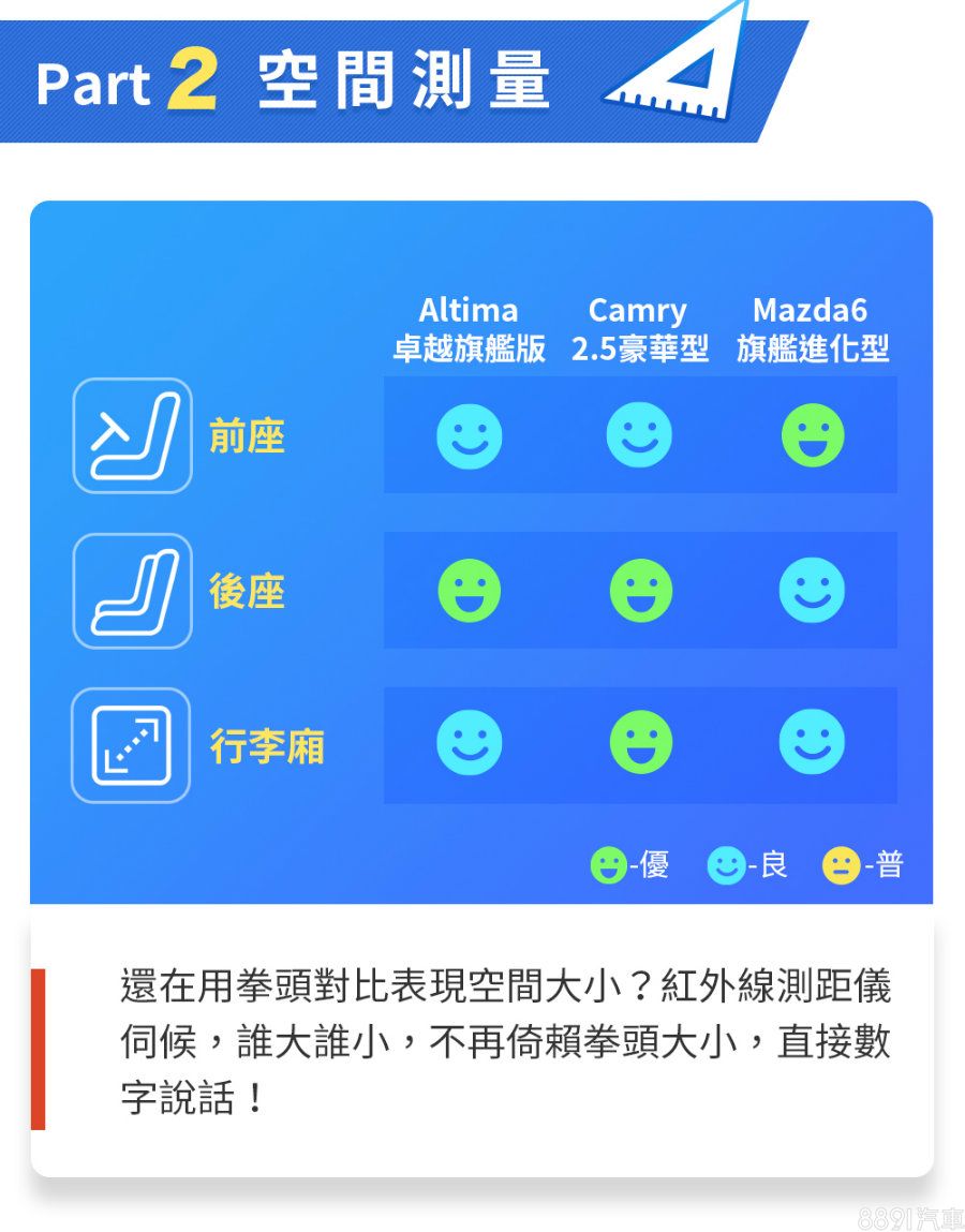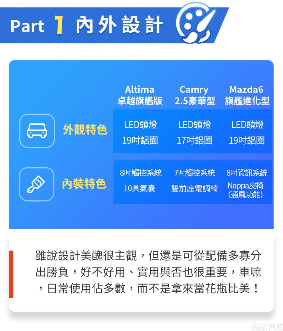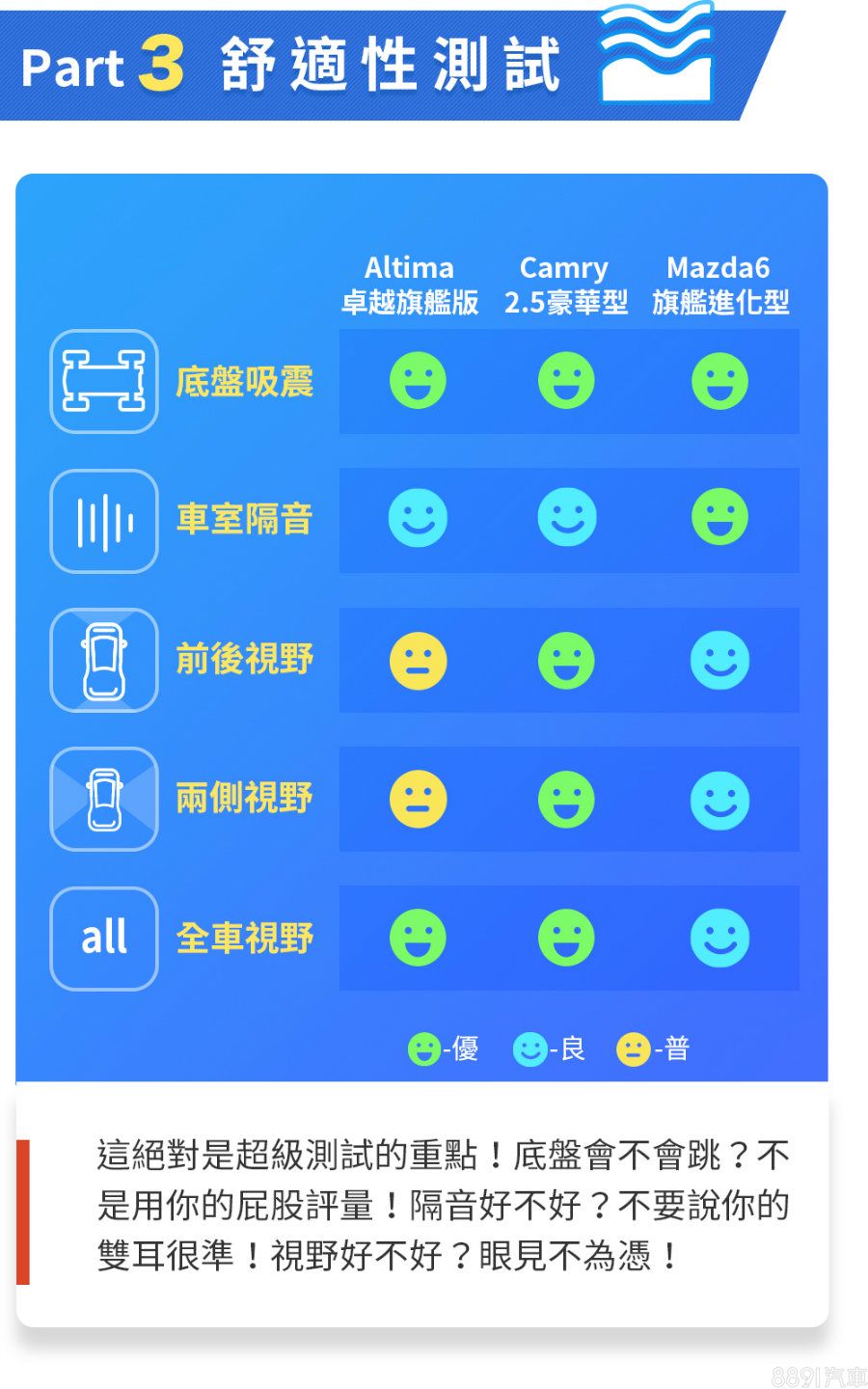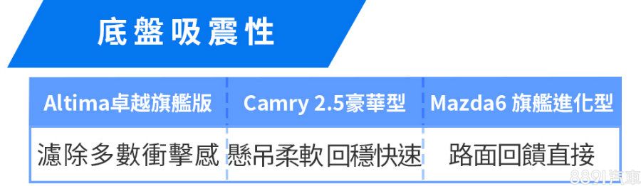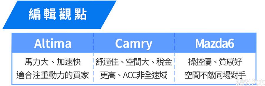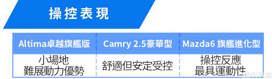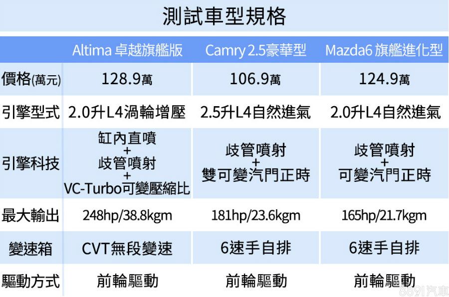 以價格和動力來看,其實Camry Hybird(117.9萬、139.9萬)才是旗鼓相當的選擇,但苦於車源關係,本次超級測試僅能邀集2.5升自然進氣動力的Camry豪華型參戰,當然在性能以及油耗會比較吃虧,不過看到僅有單一車型的Mazda6房車版,即使價格和Altima接近,動力卻是三車最弱者,由此可見,Altima在性能輸出有絕對優勢,只是在論及整體表現的超級測試就能十拿九穩嗎?