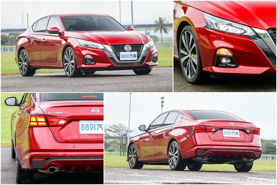 三位主角的視覺性格迥異,Altima運動風最濃厚,線條筆直又銳利,車頭V-Motion家族特色直接延伸至保桿下緣,使其看起來更加低趴;在燈組部分,LED頭燈附有AHB遠近光自動切換功能,V型日行燈位於內側,可增加視覺辨識度,鹵素方向燈則獨立於保桿上頭。Altima車尾設計較為簡單,且無LED尾燈配置,相較同級略顯陽春,所幸雙出尾管還能保留些運動氛圍。