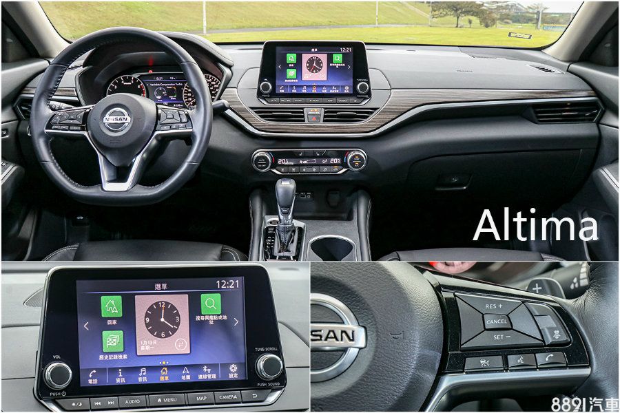 Altima內裝設計寬闊,材質用上許多軟質塑料與皮質包覆,能嗅出中大型房車的舒適氛圍;車載系統採用8吋螢幕,附有Apple CarPlay功能,畫質流暢度俱佳,僅可惜白天反光嚴重一些。ICC主動跟車做動時速為0~144km/h,但停車後便自動解除,沒有停車再開功能,車道偏移輔助是藉由煞車修正軌跡,與一般方向盤輔助不同,也無車道維持輔助功能。
