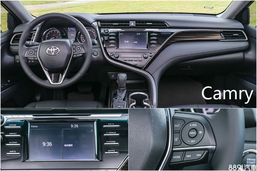 Camry中控台採用不對稱設計很有新意,同時沒有複雜造型起伏,讓整體感受開闊之餘,又有設計感,用料等級則與同級相仿,但副手座前方用上大面積皮質,讓質感向上提升。車載系統是Camry較弱的一環,7吋螢幕雖為進口車機(非車美仕),但無Apple CarPlay等手機互聯系統,僅支援基本藍芽連接,螢幕觸控反應也略慢。TSS系統的ACC做動時速為50~180km/h,也有車道偏移輔助,但實用性不如同級全速域版本。