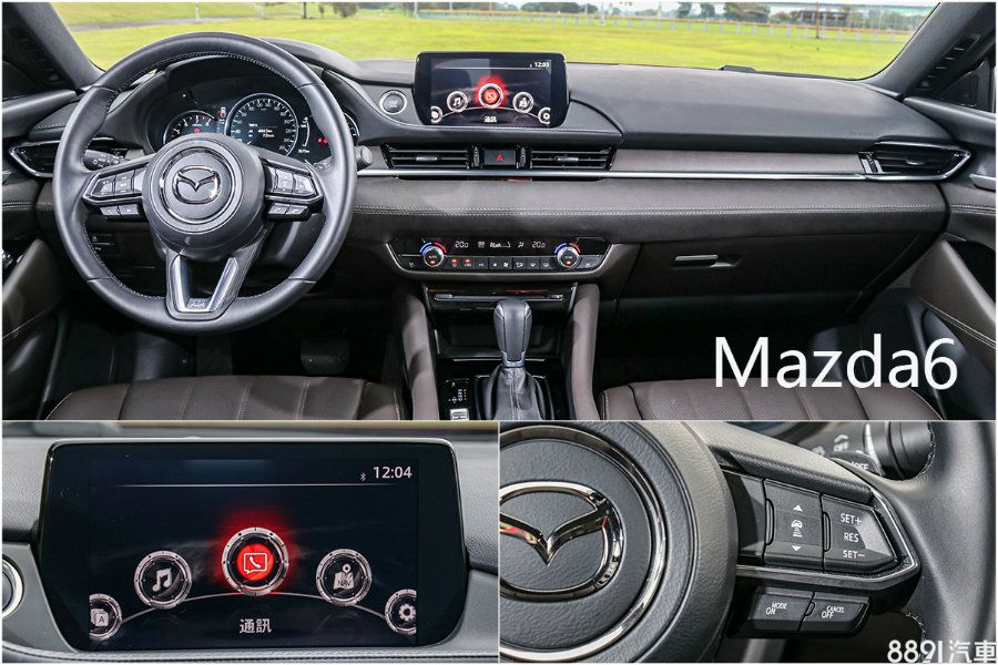 Mazda6內飾採用類麂皮、棕色皮革包覆之外,還加上實木飾板營造溫潤柔和的乘坐空間,質感優異,高聳的中控台與排檔座,也能帶給駕駛強烈包圍感,也多了點運動感受;娛樂系統可連接Apple CarPlay、也可另選配導航,介面呈現頗具質感,操作也夠流暢。配置MRCC主動巡航系統,作動時速為0~145km/h,也有車道偏移輔助系統,雖然產品世代最舊,但配備依舊有競爭力。