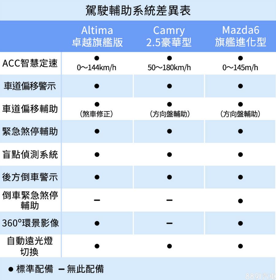 攤開主動安全比較,Mazda6仍具有相當優勢,除配備全速域ACC、車道偏移輔助外,也較其他對手多出SCBS-R倒車主動煞停,安全性更加分。本次主角Altima配備尚稱完備,也有全速域ACC,但與Mazda6相比少了停車再開功能,車道偏移輔助效果也不若另外兩車明顯,是實際用起來較可惜之處。至於Camry很明顯輸在沒有全速域ACC,實測遇到塞車時速低於40km/h就要重新設定,實用性不免打折,再加上沒有倒車緊急煞停、環景影像,使Camry 2.5豪華型在安全比較上居於末位。
