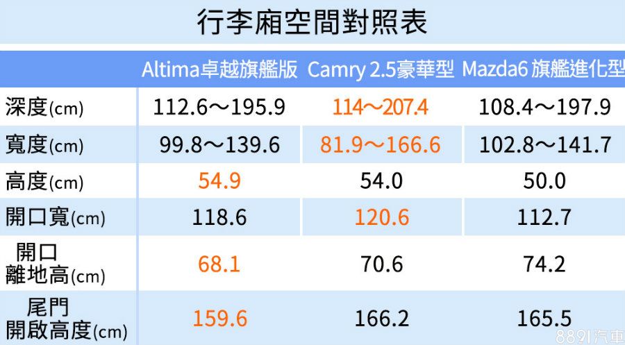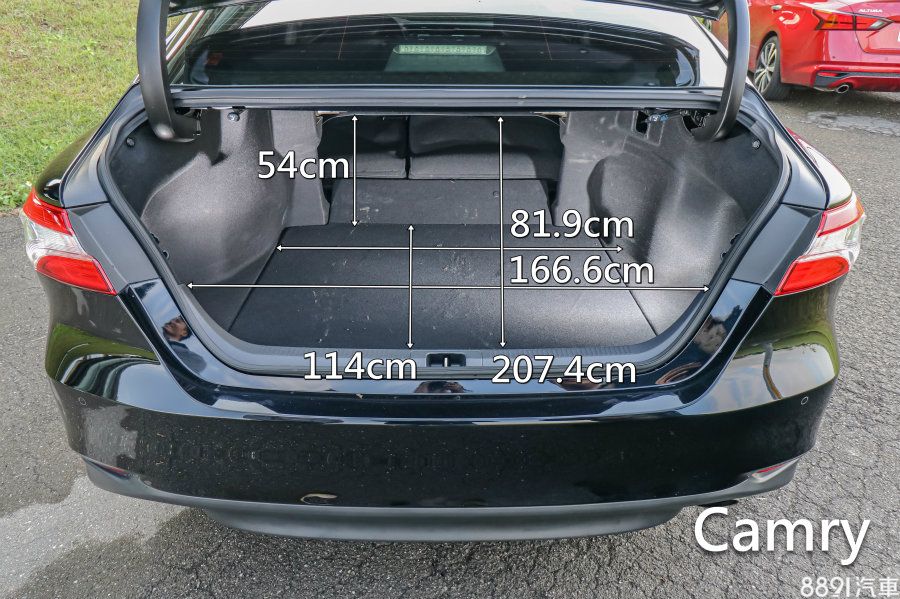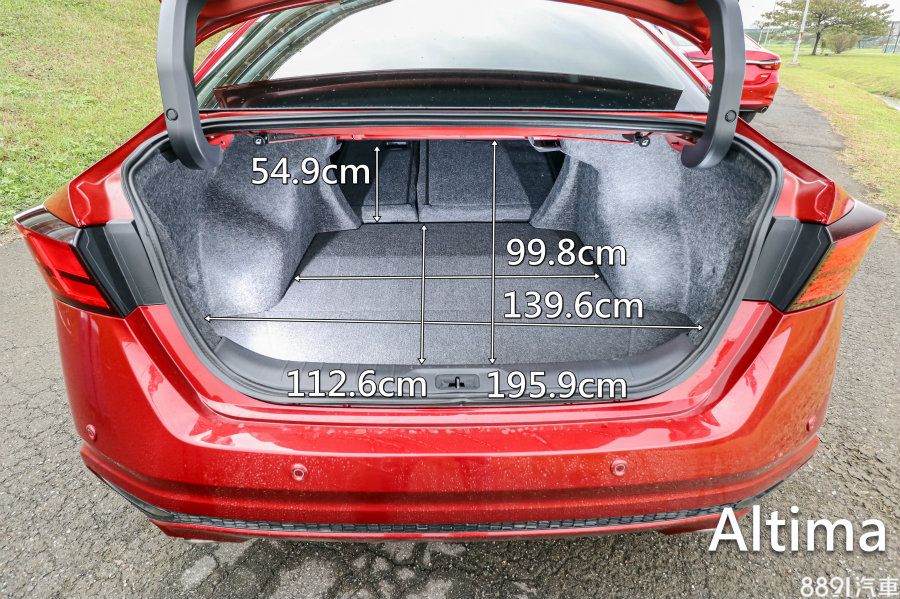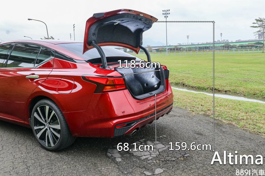 三車都沒有配備電動行李廂蓋,與豪華感受無緣,其中Altima尾門高度最低矮、行李廂開口也較矮,放置物品、關門都最為便利。但Altima卻有一項稍嫌不便的設計,必須攜帶鑰匙在身上才能由車外按壓把手開啟行李廂,否則只能從駕駛座旁按鍵開啟,便利性受到影響。