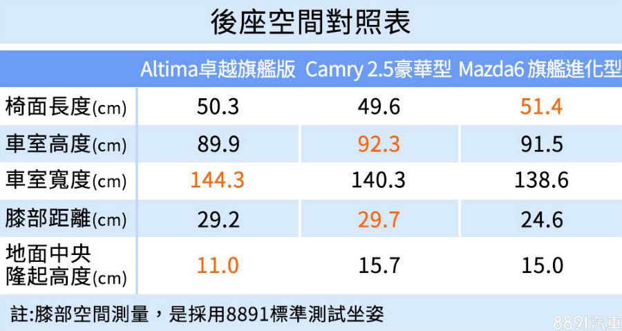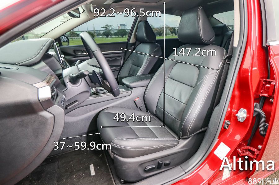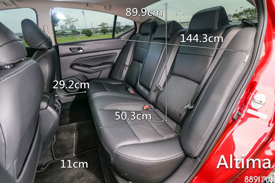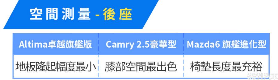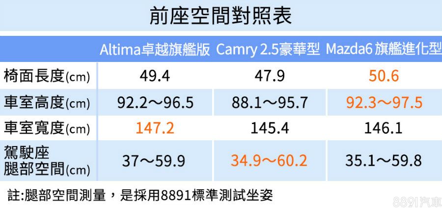 在前座表現上,Altima擁有最好的車室寬度,車室高度則僅次於Mazda6,加上淺色頂棚鋪陳下,不論實際測量、體感都蠻開闊;而Mazda6是高度、椅面長度表現出色,不過中控設計包圍感強列,又是黑色頂棚,體感反而不如數據平平的Camry寬廣。