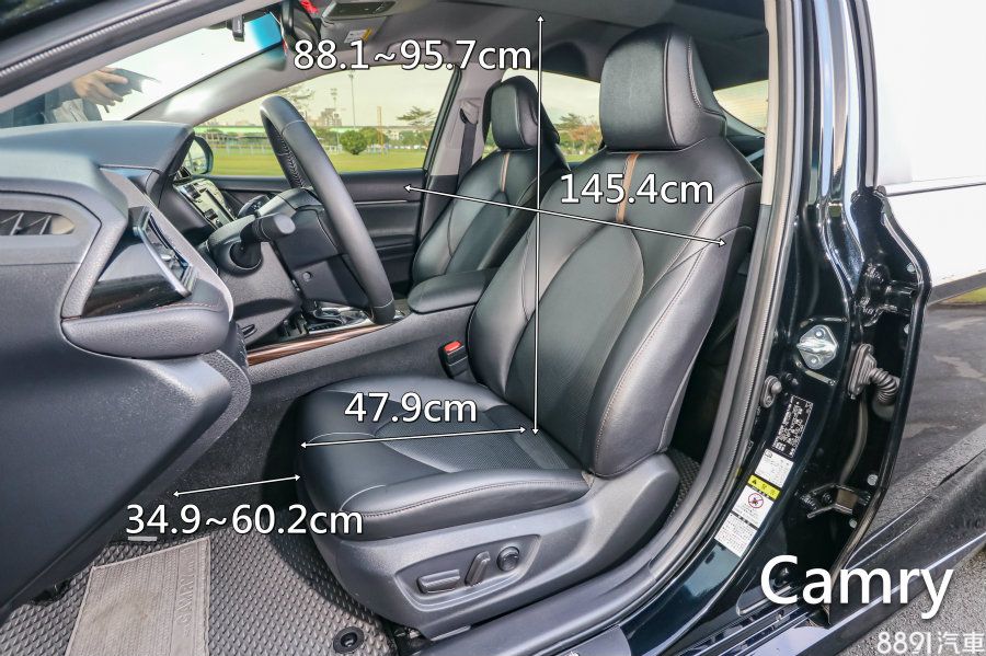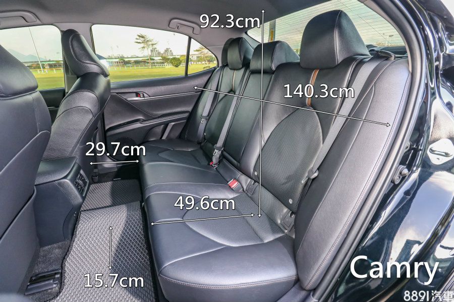 Camry座椅同樣寬大,整體造型更強調包覆性一些,讓腰部兩側得到很明確的支撐,略短的椅墊長度稍稍影響大腿支撐性,但除非身高超過180cm,否則並不是太大的問題,整體而言仍是一張相當舒適的座椅設計。雙前座均具備電動調整機能,但若要通風功能則得直上Hybrid旗艦版才能坐擁。