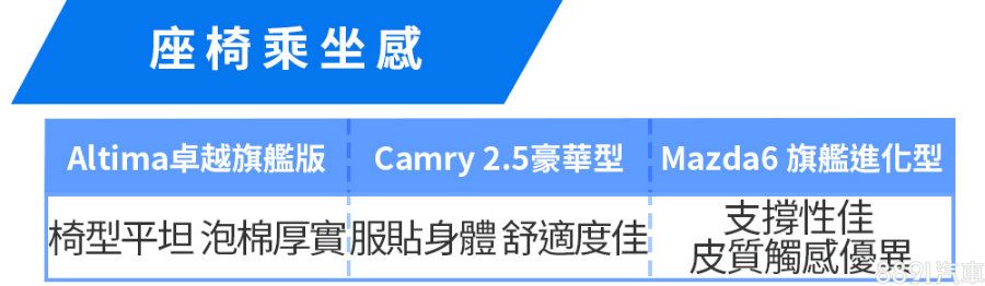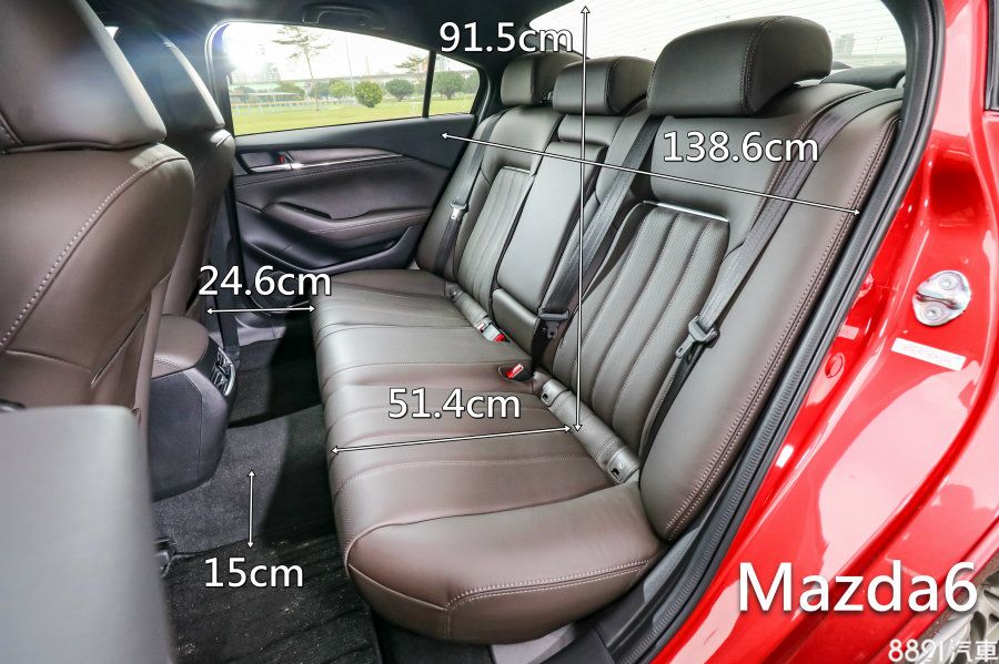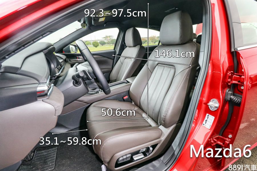 Mazda6座椅泡棉設定偏硬,但椅型設計適中,對身體各部位支撐性相當確實,Nappa真皮面料觸感柔軟細膩,相比同場對手確實有著更精緻的座艙氛圍。雙前座提供電動調整(駕駛座兩組記憶)與通風機能,對比Altima僅有加熱功能要更為適合台灣環境。