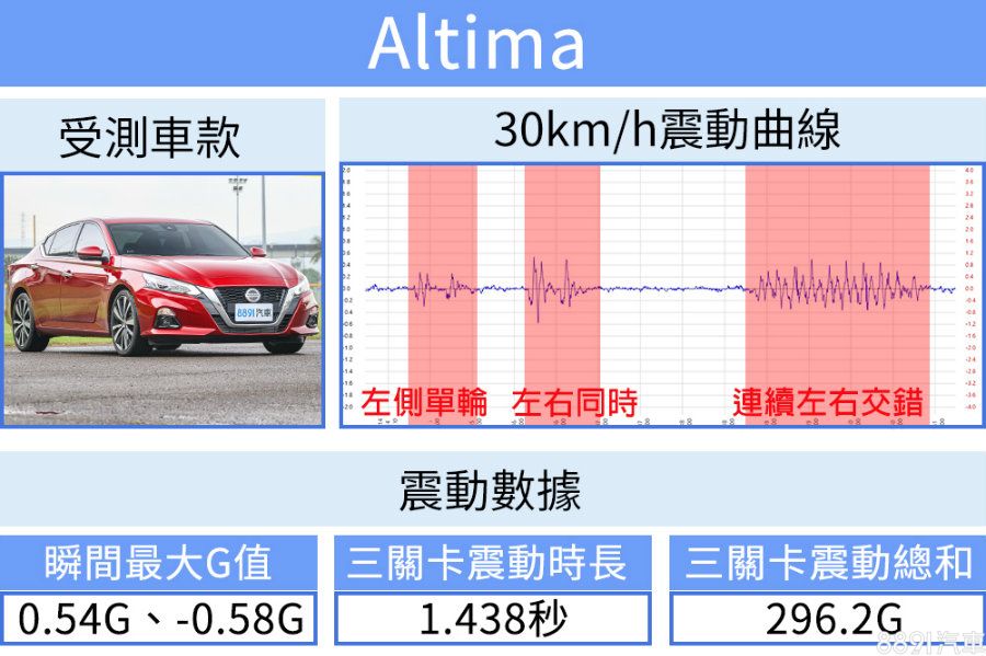 Altima外型帥勁、腳踏低扁平比19吋鋁圈,運動扮相讓人不對舒適性保有期待,實測結果卻是出乎意料,瞬間最大G 值在三車之中最低,僅0.54G、-0.58G表現出色,輪胎起伏、車內衝擊感受並不明顯。阻尼設定偏軟調,仍帶有些許二次回彈,但衝擊感較小的結果令震動總和較低,低速舒適性在三車之中最為出色。