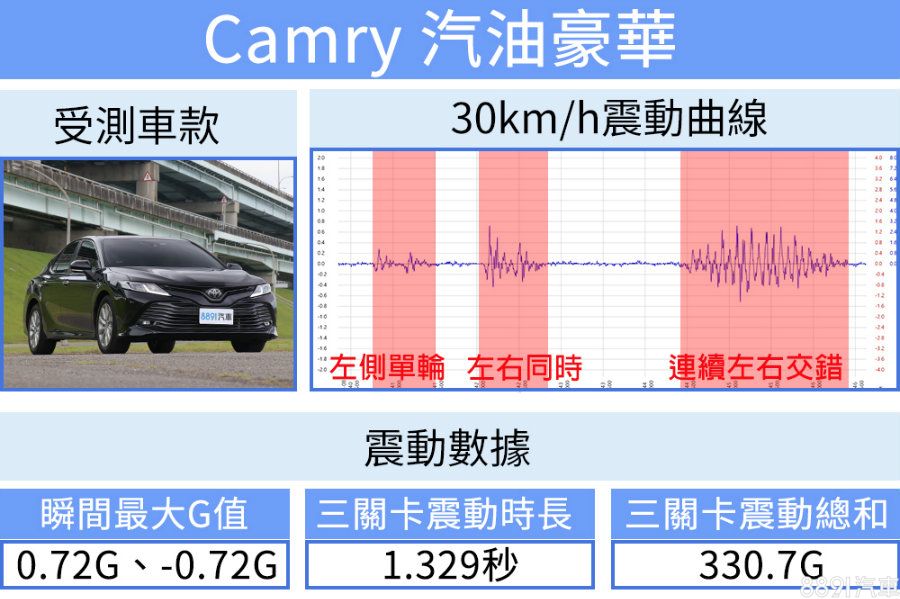 Camry在60km/h測試中表現突出,雖然G值在三車之中最為強烈,但歸功於阻尼設定令車身快速回穩,震動時長僅僅1.073秒,不僅顯著優於同場競爭對手,在過往超級測試中同樣名列前茅,更出現60km/h震動總和低於30km/h的情況,代表懸吊設定針對主要行車速域有更好的舒適表現。