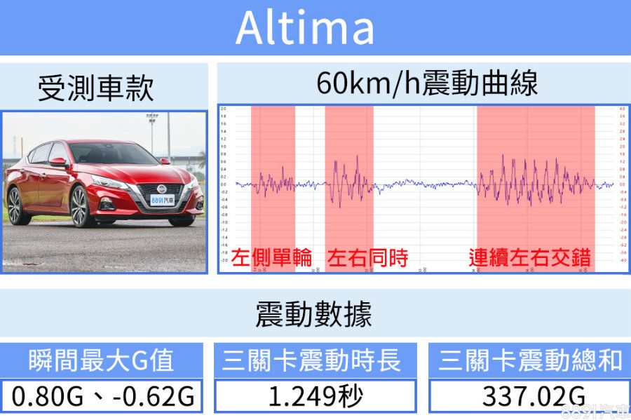 車速提高, Altima仍保有三車之中最低的瞬間G值,懸吊應付高速通過減速墊仍顯得游刃有餘,車內乘客衝擊感不致太過強烈,只不過二次晃動仍然存在,60km/h震動總和稍稍高過兩輛對手。置身Altima以60km/h通過測試陣仗,輪胎衝擊基本上被盡可能濾除,過程中車身微微的上下擺盪雖然並不惱人,但那分穩定感還是略遜Camry一點。