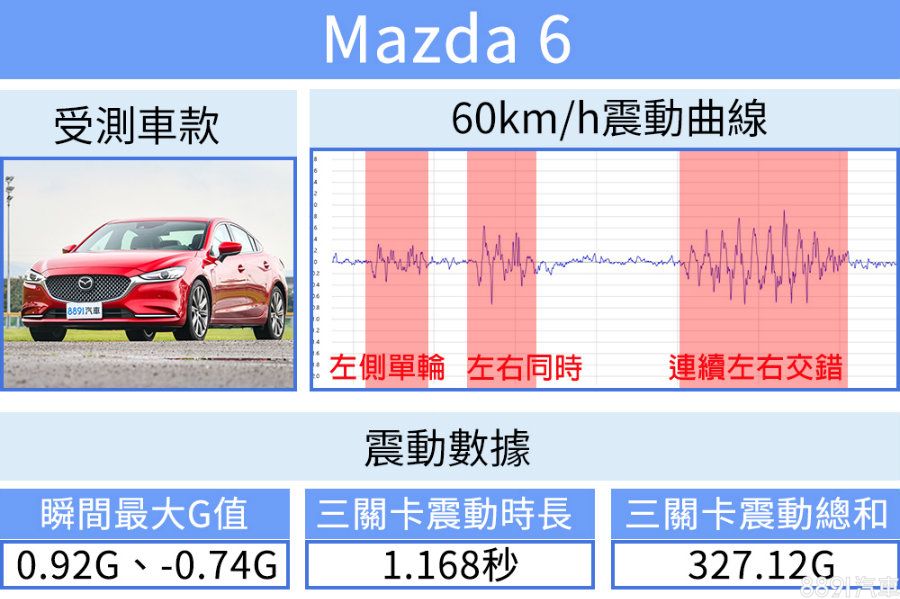 Mazda6在60km/h測試延續了與低速相同的底盤調性,回饋感受清晰、懸吊運作俐落而不拖泥帶水,有趣的是對比30km/h、60km/h兩者各項數據,除了震動時長因車速提高顯著縮短之外,最大G值與震動總和都維持在相近水準,震動總和甚至些微下降一些,讓Mazda6在各速域都保有相近的舒適表現。