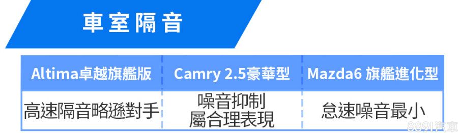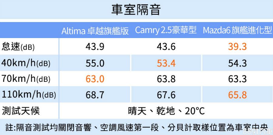 三車均為中大型房車級距,隔音表現自然該有一定的水準,從實測數據可以發現Altima與Camry在各速域表現都屬安靜,但由於Altima配胎寬度達235,較大的接地面積並不利於胎噪表現,讓Altima數據略高過Camry些許。而Mazda6則歸功於較好的車室隔音效果,在怠速與110km/h噪音測試中顯著優於對手,進而擁有較好的隔音表現。