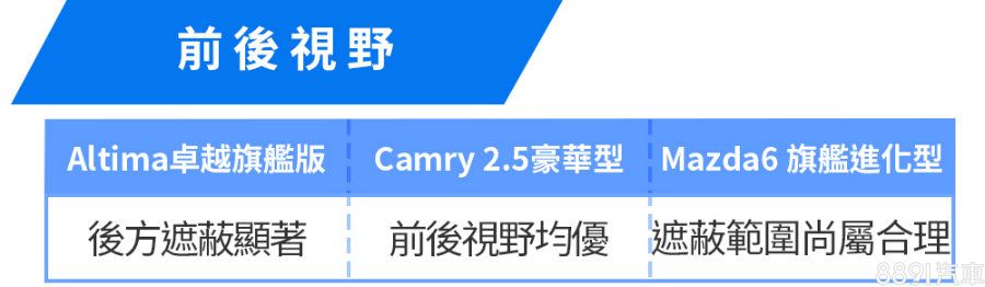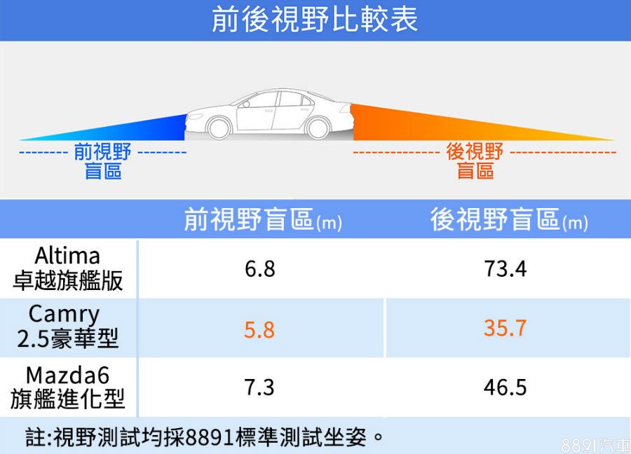 三車前方視野都沒有太明顯的差異,6~7m的死角距離均屬合理範圍,其中以Camry儀錶台最為低矮,遮蔽視線較少因而成績出色;後方視野則與車身造型較為相關,越顯流線、低矮的造型往往影響後方視野甚鉅。